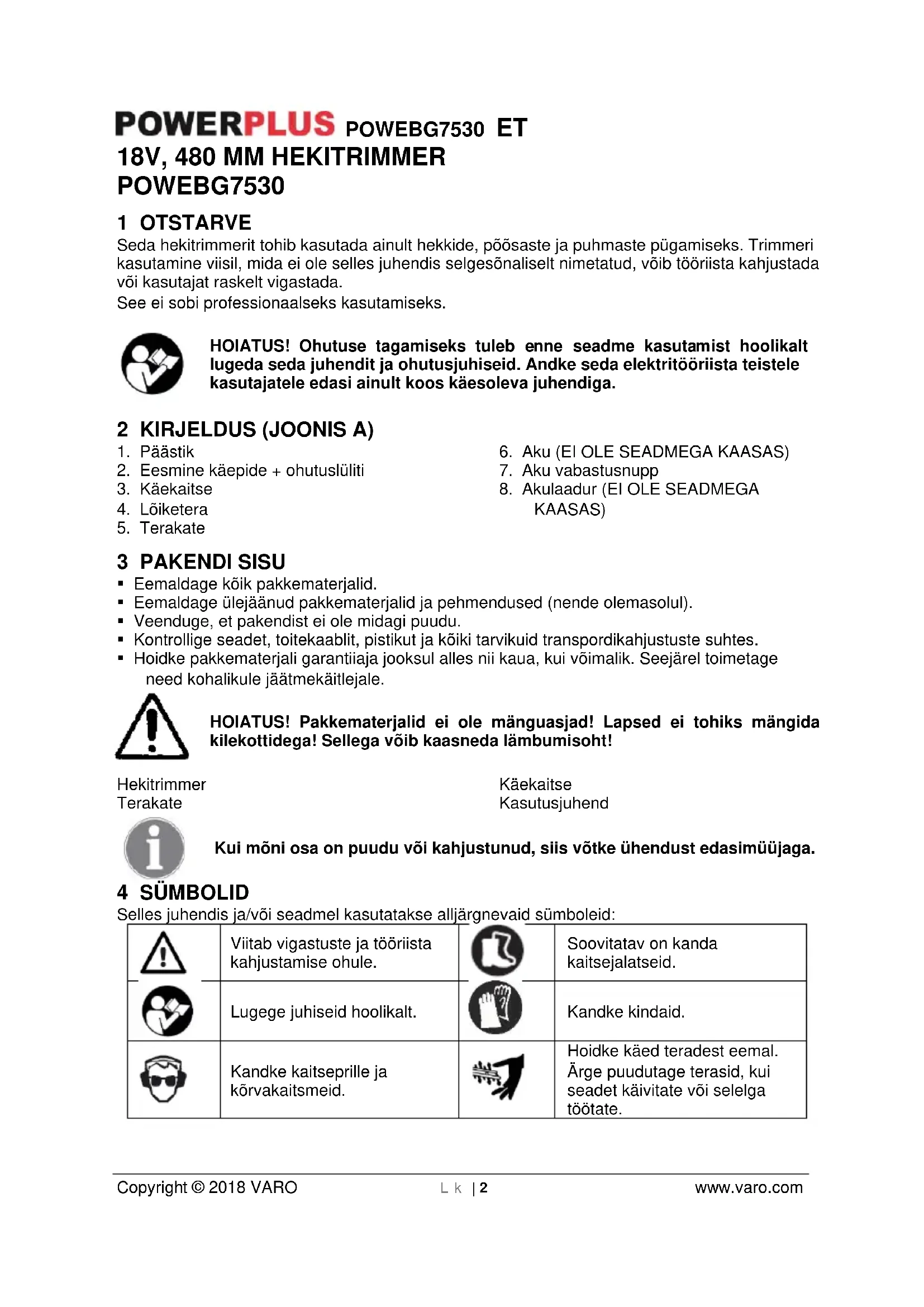 Hoidke käed teradest eemal. Ärge puudutage terasid, kui seadet käivitate või selelga töötate.POWEBG7530 ET Copyright © 2018 VARO Lk | 3 www.varo.com