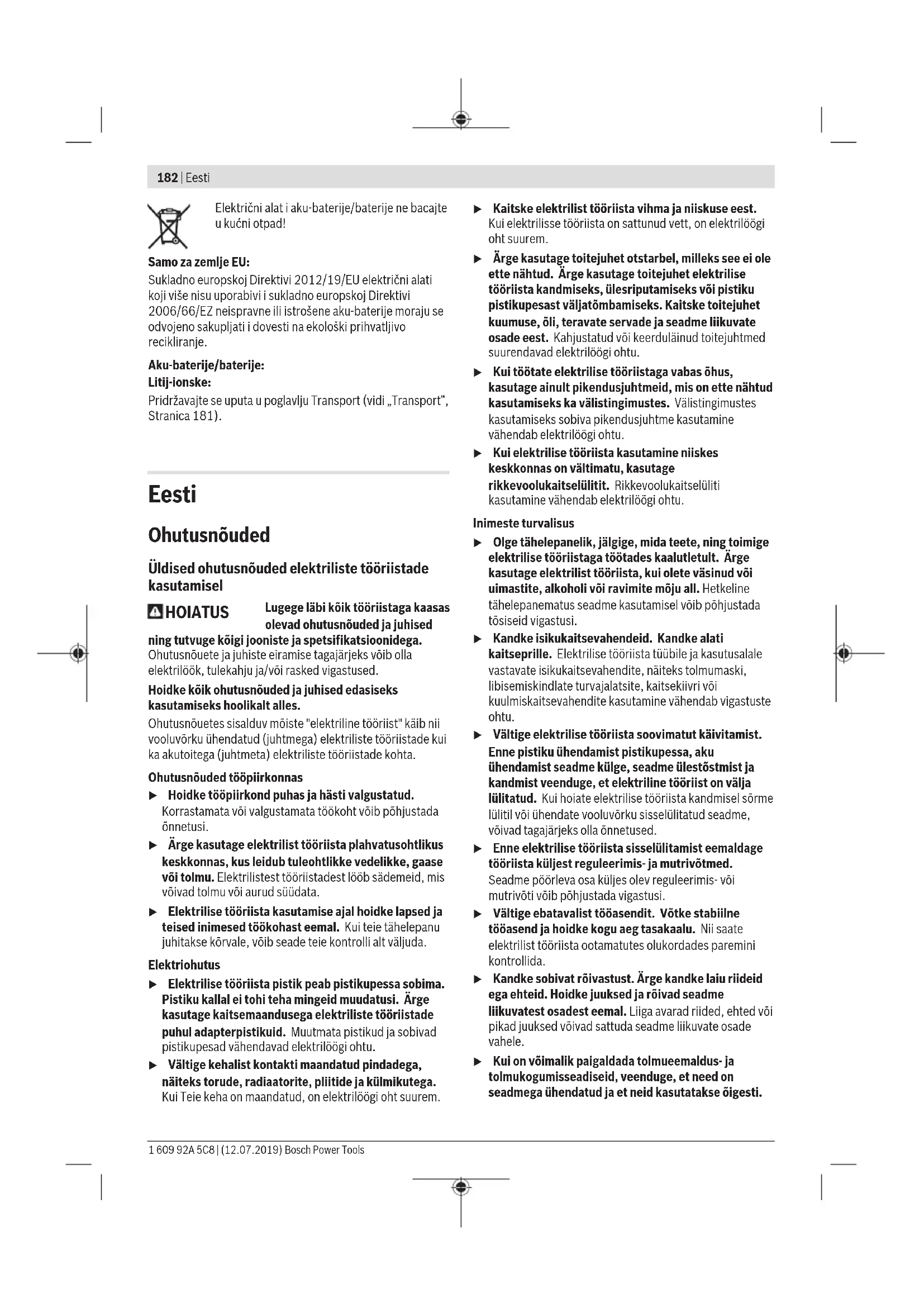 Područje većeg broja okretaja; za rad s malim promjerom bušenja. u Prekidač za biranje brzina uvijek pomaknite do graničnika. Električni alat bi se inače mogao oštetiti. Zaštita od preopterećenja ovisna o temperaturi Kod namjenske uporabe se električni alat ne može preopteretiti. Kod prevelikog opterećenja ili napuštanja područja dopuštene radne temperature smanjit će se broj okretaja. Električni alat radi ponovno s punim brojem okretaja tek nakon postizanja dopuštene radne temperature. Automatska blokada vretena (Auto-Lock) Ako prekidač za uključivanje/isključivanje (11) nije pritisnut, blokira se bušno vreteno, a time i prihvat alata. To omogućava uvrtanje vijaka i kod ispražnjene aku-baterije, odnosno korištenje električnog alata kao izvijača. Upute za rad u Električni alat stavite na vijak samo u isključenom stanju. Rotirajući radni alati mogu kliznuti. Prije uvrtanja većih, duljih vijaka u tvrde materijale trebate s promjerom jezgre navoja prethodno bušiti na cca. 2/3 duljine vijka. Za vađenje bita odvijača ili univerzalnog držača ne smijete koristiti pomagala. Kopča remena za nošenje Pomoću kopče remena za nošenje (6) možete objesiti električni alat npr. na remen. U tom slučaju imate obje ruke slobodne i električni alat je u svakom trenutku pripravan za držanje. Održavanje i servisiranje Održavanje i čišćenje u Prije svih radova na električnom alatu (npr. održavanje, zamjena alata, itd.), kao i kod njegovog transporta i spremanja, aku-bateriju treba izvaditi iz električnog alata. Kod nehotičnog aktiviranja prekidača za uključivanje/isključivanje postoji opasnost od ozljeda. u Električni alat i otvore za hlađenje održavajte čistima kako bi se moglo dobro i sigurno raditi. Servisna služba i savjeti o uporabi Naša servisna služba će odgovoriti na vaša pitanja o popravku i održavanju vašeg proizvoda, kao i o rezervnim dijelovima. Crteže u rastavljenom obliku i informacije o rezervnim dijelovima možete naći i na našoj adresi: www.bosch-pt.com Tim Bosch savjetnika o uporabi rado će odgovoriti na vaša pitanja o našim proizvodima i njihovom priboru. U slučaju upita ili naručivanja rezervnih dijelova, molimo vas obavezno navedite 10‑znamenkasti kataloški broj s tipske pločice proizvoda. Hrvatski Robert Bosch d.o.o PT/SHR-BSC Kneza Branimira 22 10040 Zagreb Tel.: +385 12 958 051 Fax: +385 12 958 050 E-Mail: RBKN-bsc@hr.bosch.com www.bosch.hr Bosnia Elektro-Servis Vl. Mehmed Nalić Dzemala Bijedića bb 71000 Sarajevo Tel./Fax: +387 33454089 E-Mail: bosch@bih.net.ba Transport Litij-ionske aku-baterije podliježu zakonu o transportu opasnih tvari. Korisnik bez ikakvih preduvjeta može transportirati aku-baterije cestovnim transportom. Ako transport obavlja treća strana (npr. transport zrakoplovom ili špedicija), treba se pridržavati posebnih zahtjeva za ambalažu i označavanje. Kod pripreme ovakvih pošiljki za transport prethodno se treba savjetovati sa stručnjakom za transport opasnih tvari. Aku-bateriju šaljite nekim transportnim sredstvom samo ako je njezino kućište neoštećeno. Oblijepite otvorene kontakte i zapakirajte aku-bateriju tako da se ne može pomicati u ambalaži. Pridržavajte se i eventualnih dodatnih nacionalnih propisa. Zbrinjavanje Električne alate, aku-baterije, pribor i ambalažu treba dovesti na ekološki prihvatljivo recikliranje. Bosch Power Tools 1 609 92A 5C8 | (12.07.2019)182 | Eesti Električni alat i aku-baterije/baterije ne bacajte u kućni otpad! Samo za zemljeEU: Sukladno europskoj Direktivi 2012/19/EU električni alati koji više nisu uporabivi i sukladno europskoj Direktivi 2006/66/EZ neispravne ili istrošene aku-baterije moraju se odvojeno sakupljati i dovesti na ekološki prihvatljivo recikliranje. Aku-baterije/baterije: Litij-ionske: Pridržavajte se uputa u poglavlju Transport (vidi „Transport“, Stranica181). Eesti Ohutusnõuded Üldised ohutusnõuded elektriliste tööriistade kasutamisel HOIATUS Lugege läbi kõik tööriistaga kaasas olevad ohutusnõuded ja juhised ning tutvuge kõigi jooniste ja spetsifikatsioonidega. Ohutusnõuete ja juhiste eiramise tagajärjeks võib olla elektrilöök, tulekahju ja/või rasked vigastused. Hoidke kõik ohutusnõuded ja juhised edasiseks kasutamiseks hoolikalt alles. Ohutusnõuetes sisalduv mõiste "elektriline tööriist" käib nii vooluvõrku ühendatud (juhtmega) elektriliste tööriistade kui ka akutoitega (juhtmeta) elektriliste tööriistade kohta. Ohutusnõuded tööpiirkonnas u Hoidke tööpiirkond puhas ja hästi valgustatud. Korrastamata või valgustamata töökoht võib põhjustada õnnetusi. u Ärge kasutage elektrilist tööriista plahvatusohtlikus keskkonnas, kus leidub tuleohtlikke vedelikke, gaase või tolmu. Elektrilistest tööriistadest lööb sädemeid, mis võivad tolmu või aurud süüdata. u Elektrilise tööriista kasutamise ajal hoidke lapsed ja teised inimesed töökohast eemal. Kui teie tähelepanu juhitakse kõrvale, võib seade teie kontrolli alt väljuda. Elektriohutus u Elektrilise tööriista pistik peab pistikupessa sobima. Pistiku kallal ei tohi teha mingeid muudatusi. Ärge kasutage kaitsemaandusega elektriliste tööriistade puhul adapterpistikuid. Muutmata pistikud ja sobivad pistikupesad vähendavad elektrilöögi ohtu. u Vältige kehalist kontakti maandatud pindadega, näiteks torude, radiaatorite, pliitide ja külmikutega. Kui Teie keha on maandatud, on elektrilöögi oht suurem. u Kaitske elektrilist tööriista vihma ja niiskuse eest. Kuielektrilisse tööriista on sattunud vett, on elektrilöögi oht suurem. u Ärge kasutage toitejuhet otstarbel, milleks see ei ole ette nähtud. Ärge kasutage toitejuhet elektrilise tööriista kandmiseks, ülesriputamiseks või pistiku pistikupesast väljatõmbamiseks. Kaitske toitejuhet kuumuse, õli, teravate servade ja seadme liikuvate osade eest. Kahjustatud või keerduläinud toitejuhtmed suurendavad elektrilöögi ohtu. u Kui töötate el