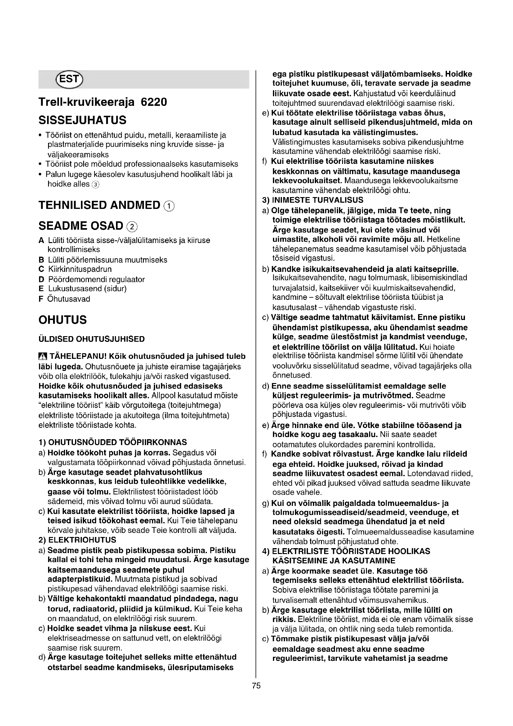 - Palun lugege käesolev kasutusjuhend hoolikalt läbi ja hoidke alles 3 TEHNILISED ANDMED 1 SEADME OSAD 2 A Lüliti tööriista sisse-/väljalülitamiseks ja kiiruse kontrollimiseks B Lüliti pöörlemissuuna muutmiseks C Kiirkinnituspadrun D Pöördemomendi regulaator E Lukustusasend (sidur) F Õhutusavad OHUTUS ÜLDISED OHUTUSJUHISED TÄHELEPANU! Kõik ohutusnõuded ja juhised tuleb läbi lugeda. Ohutusnõuete ja juhiste eiramise tagajärjeks võib olla elektrilöök, tulekahju ja/või rasked vigastused. Hoidke kõik ohutusnõuded ja juhised edasiseks kasutamiseks hoolikalt alles. Allpool kasutatud mõiste “elektriline tööriist” käib võrgutoitega (toitejuhtmega) elektriliste tööriistade ja akutoitega (ilma toitejuhtmeta) elektriliste tööriistade kohta.