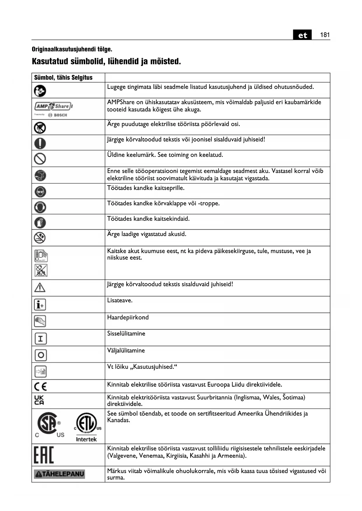 Originaalkasutusjuhendi tõlge. Kasutatud sümbolid, lühendid ja mõisted. Sümbol, tähis Selgitus Lugege tingimata läbi seadmele lisatud kasutusjuhend ja üldised ohutusnõuded. AMPShare on ühiskasutatav akusüsteem, mis võimaldab paljusid eri kaubamärkide tooteid kasutada kõigest ühe akuga. Ärge puudutage elektrilise tööriista pöörlevaid osi. Järgige kõrvaltoodud tekstis või joonisel sisalduvaid juhiseid! Üldine keelumärk. See toiming on keelatud. Enne selle tööoperatsiooni tegemist eemaldage seadmest aku. Vastasel korral võib elektriline tööriist soovimatult käivituda ja kasutajat vigastada. Töötades kandke kaitseprille. Töötades kandke kõrvaklappe või -troppe. Töötades kandke kaitsekindaid. Ärge laadige vigastatud akusid. Kaitske akut kuumuse eest, nt ka pideva päikesekiirguse, tule, mustuse, vee ja niiskuse eest. Järgige kõrvaltoodud tekstis sisalduvaid juhiseid! Lisateave. Haardepiirkond Sisselülitamine Väljalülitamine Vt lõiku „Kasutusjuhised.“ Kinnitab elektrilise tööriista vastavust Euroopa Liidu direktiividele. Kinnitab elektritööriista vastavust Suurbritannia (Inglismaa, Wales, Šotimaa) direktiividele. See sümbol tõendab, et toode on sertifitseeritud Ameerika Ühendriikides ja Kanadas. Kinnitab elektrilise tööriista vastavust tolliliidu riigisisestele tehnilistele eeskirjadele (Valgevene, Venemaa, Kirgiisia, Kasahhi ja Armeenia). Märkus viitab võimalikule ohuolukorrale, mis võib kaasa tuua tõsised vigastused või surma. max.50°C182