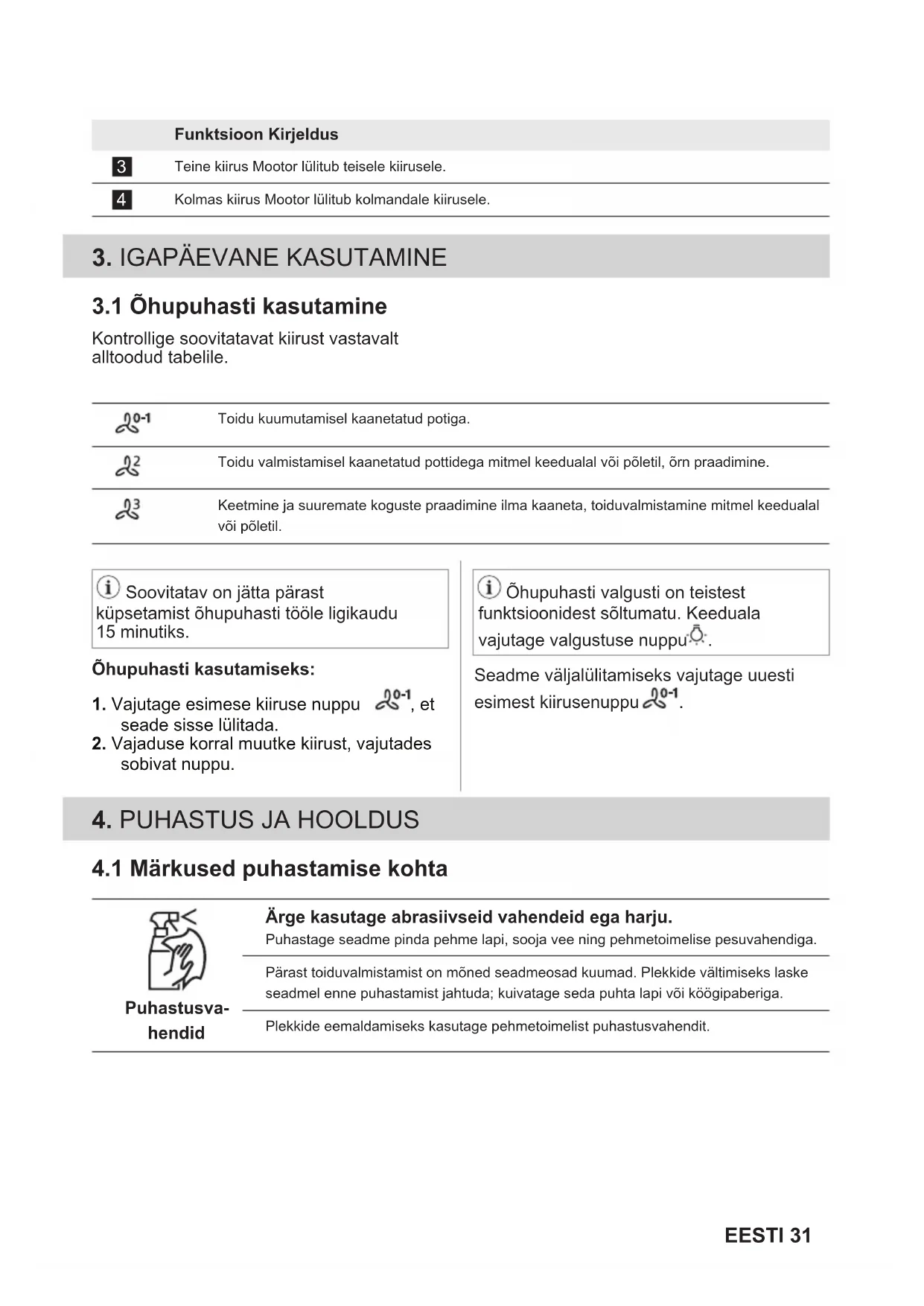Kontrollige soovitatavat kiirust vastavalt alltoodud tabelile. Toidu kuumutamisel kaanetatud potiga.Toidu valmistamisel kaanetatud pottidega mitmel keedualal või põletil, õrn praadimine.Keetmine ja suuremate koguste praadimine ilma kaaneta, toiduvalmistamine mitmel keedualalvõi põletil. Soovitatav on jätta pärast küpsetamist õhupuhasti tööle ligikaudu 15 minutiks. Õhupuhasti kasutamiseks:
