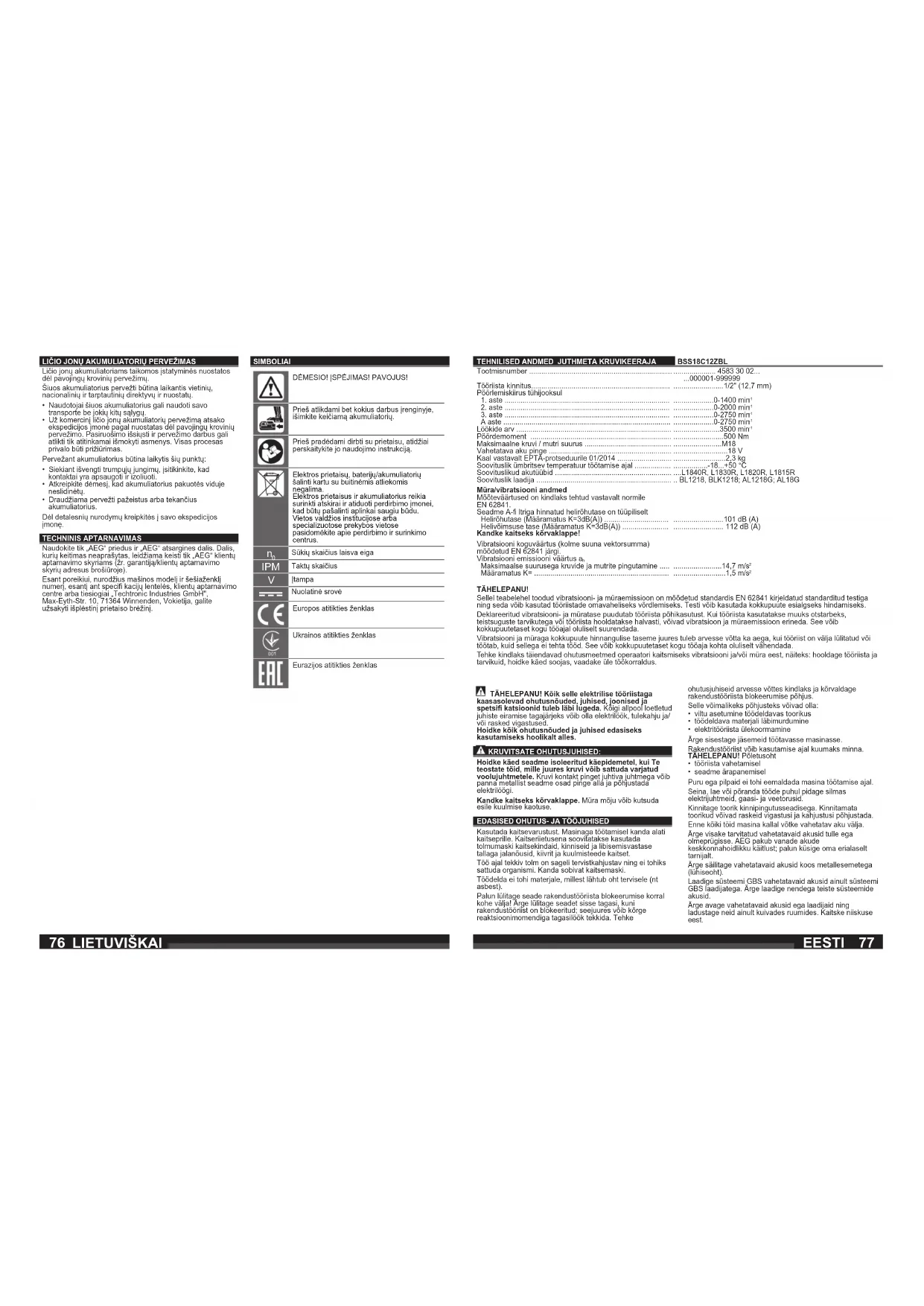 - seadme ärapanemisel Puru ega pilpaid ei tohi eemaldada masina töötamise ajal. Seina, lae või põranda tööde puhul pidage silmas elektrijuhtmeid, gaasi- ja veetorusid. Kinnitage toorik kinnipingutusseadisega. Kinnitamata toorikud võivad raskeid vigastusi ja kahjustusi põhjustada. Enne kõiki töid masina kallal võtke vahetatav aku välja. Ärge visake tarvitatud vahetatavaid akusid tulle ega olmeprügisse. AEG pakub vanade akude keskkonnahoidlikku käitlust; palun küsige oma erialaselt tarnijalt. Ärge säilitage vahetatavaid akusid koos metallesemetega (lühiseoht). Laadige süsteemi GBS vahetatavaid akusid ainult süsteemi GBS laadijatega. Ärge laadige nendega teiste süsteemide akusid. Ärge avage vahetatavaid akusid ega laadijaid ning ladustage neid ainult kuivades ruumides. Kaitske niiskuse eest. TÄHELEPANU! Sellel teabelehel toodud vibratsiooni- ja müraemissioon on mõõdetud standardis EN 62841 kirjeldatud standarditud testiga ning seda võib kasutad tööriistade omavaheliseks võrdlemiseks. Testi võib kasutada kokkupuute esialgseks hindamiseks. Deklareeritud vibratsiooni- ja müratase puudutab tööriista põhikasutust. Kui tööriista kasutatakse muuks otstarbeks, teistsuguste tarvikutega või tööriista hooldatakse halvasti, võivad vibratsioon ja müraemissioon erineda. See võib kokkupuutetaset kogu tööajal oluliselt suurendada. Vibratsiooni ja müraga kokkupuute hinnangulise taseme juures tuleb arvesse võtta ka aega, kui tööriist on välja lülitatud või töötab, kuid sellega ei tehta tööd. See võib kokkupuutetaset kogu tööaja kohta oluliselt vähendada. Tehke kindlaks täiendavad ohutusmeetmed operaatori kaitsmiseks vibratsiooni ja/või müra eest, näiteks: hooldage tööriista ja tarvikuid, hoidke käed soojas, vaadake üle töökorraldus. LIETUVIŠKAI