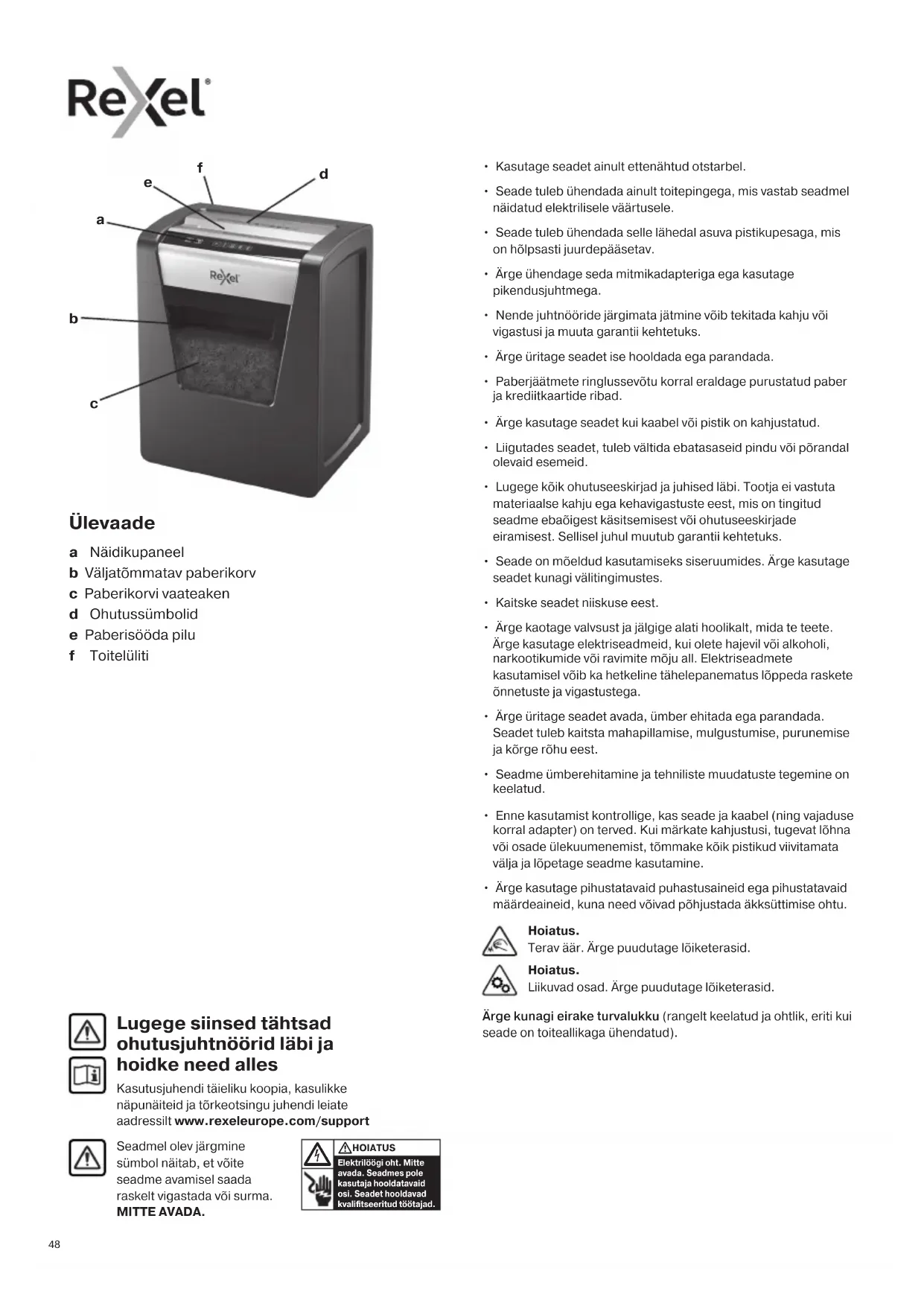 Lugege siinsed tähtsad ohutusjuhtnöörid läbi ja hoidke need alles Kasutusjuhendi täieliku koopia, kasulikke näpunäiteid ja tõrkeotsingu juhendi leiate aadressilt www.rexeleurope.com/support Ärge kunagi eirake turvalukku (rangelt keelatud ja ohtlik, eriti kui seade on toiteallikaga ühendatud). Hoiatus. Terav äär. Ärge puudutage lõiketerasid. Hoiatus. Liikuvad osad. Ärge puudutage lõiketerasid. Ülevaade a Näidikupaneel b Väljatõmmatav paberikorv c Paberikorvi vaateaken d Ohutussümbolid e Paberisööda pilu f Toitelüliti