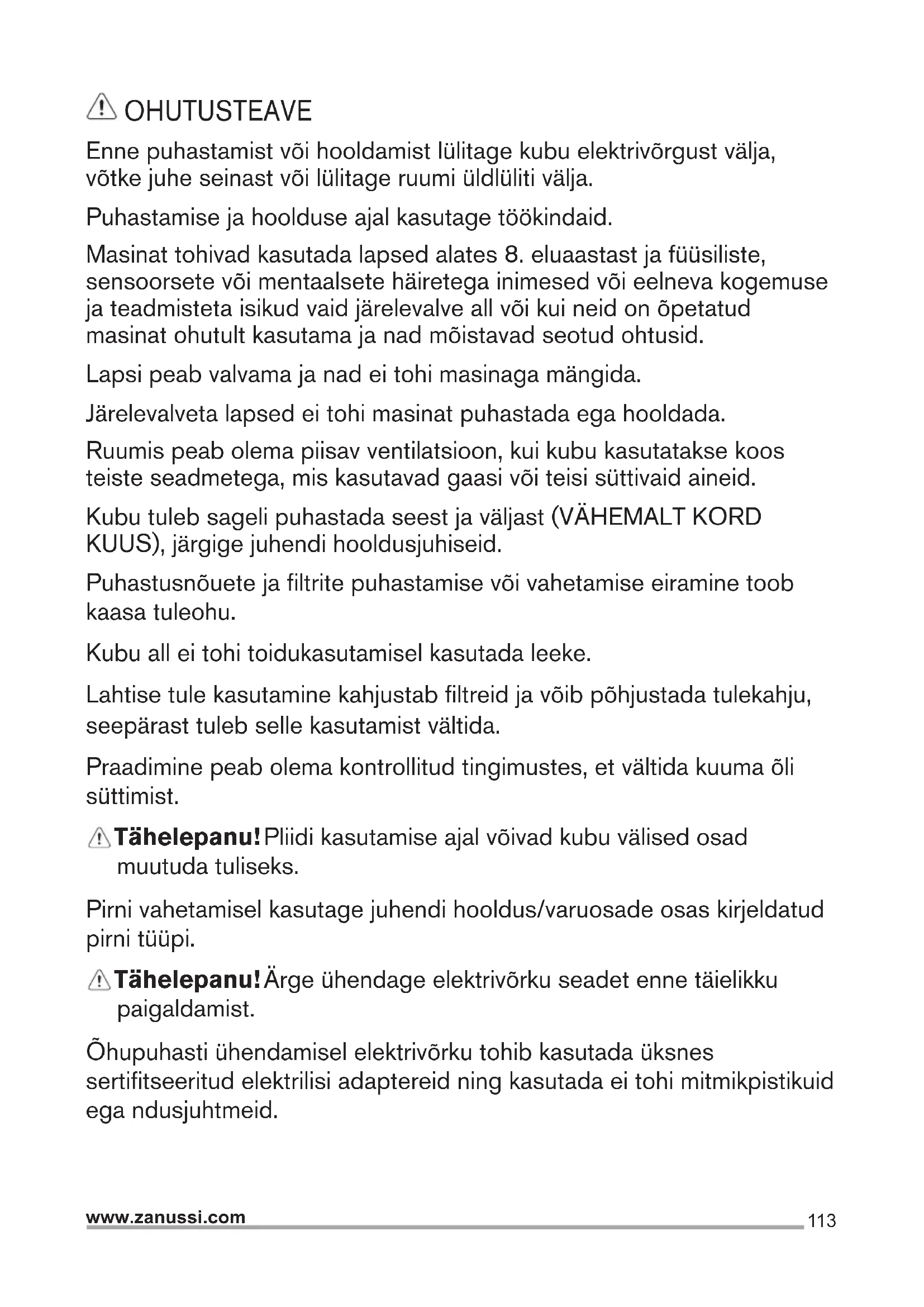 Исклопчајте апарат са електричне мреже. Упозорење! Пре него што додирнете лампе уверите се да се се охладиле. Користите само халогене лампе у облику свећице Ø35мм Е14 28W. Замените оштећену сијалицу. Користите само ЛЕД сијалице макс. 2,5W-Е14. За више детаља, погледајте приложени лист "ILCOS D" (алфанумеричка позиција "1e").113 www.zanussi.com OHUTUSTEAVE Enne puhastamist või hooldamist lülitage kubu elektrivõrgust välja, võtke juhe seinast või lülitage ruumi üldlüliti välja. Puhastamise ja hoolduse ajal kasutage töökindaid. Masinat tohivad kasutada lapsed alates 8. eluaastast ja füüsiliste, sensoorsete või mentaalsete häiretega inimesed või eelneva kogemuse ja teadmisteta isikud vaid järelevalve all või kui neid on õpetatud masinat ohutult kasutama ja nad mõistavad seotud ohtusid. Lapsi peab valvama ja nad ei tohi masinaga mängida. Järelevalveta lapsed ei tohi masinat puhastada ega hooldada. Ruumis peab olema piisav ventilatsioon, kui kubu kasutatakse koos teiste seadmetega, mis kasutavad gaasi või teisi süttivaid aineid. Kubu tuleb sageli puhastada seest ja väljast (VÄHEMALT KORD KUUS), järgige juhendi hooldusjuhiseid. Puhastusnõuete ja filtrite puhastamise või vahetamise eiramine toob kaasa tuleohu. Kubu all ei tohi toidukasutamisel kasutada leeke. Lahtise tule kasutamine kahjustab filtreid ja võib põhjustada tulekahju, seepärast tuleb selle kasutamist vältida. Praadimine peab olema kontrollitud tingimustes, et vältida kuuma õli süttimist. Tähelepanu! Pliidi kasutamise ajal võivad kubu välised osad muutuda tuliseks. Pirni vahetamisel kasutage juhendi hooldus/varuosade osas kirjeldatud pirni tüüpi. Tähelepanu! Ärge ühendage elektrivõrku seadet enne täielikku paigaldamist. Õhupuhasti ühendamisel elektrivõrku tohib kasutada üksnes sertifitseeritud elektrilisi adaptereid ning kasutada ei tohi mitmikpistikuid ega ndusjuhtmeid.114 www.zanussi.com OHUTUSJUHISED Tehniliste ja ohutusmeetmete kasutamisel järgige alati kohalike võimude kehtestatud nõudeid. Kubu sissetõmmatud õhku ei tohi juhtida torusse, kuhu juhitakse ka gaasil või teistel kütustel töötavate seadmete suits. Ärge kasutage kubu, kui pirnid ei ole nõuetekohaselt paigaldatud, elektrilöögioht. Mitte kasutada kubu ilma võreta! Kubu ei TOHI kunagi kasutada toetuspinnana, kui seda ei ole eraldi välja toodud. Paigaldamisel kasutage kaasasolevaid kinnituskruvisid, kui neid ei ole kaasas, siis ostke õiget tüüpi kruvid. Kasutage kruvisid, mille pikkus vastab paigaldusjuhistele. Kahtluse korral pöörduge teeninduse või vajaliku väljaõppega inimese poole. TÄHELEPANU! Puudulik kruvide ja kinnitusseadmete paigaldamine, mis ei vasta juhistele, toob kaasa elektrilöögiohu.