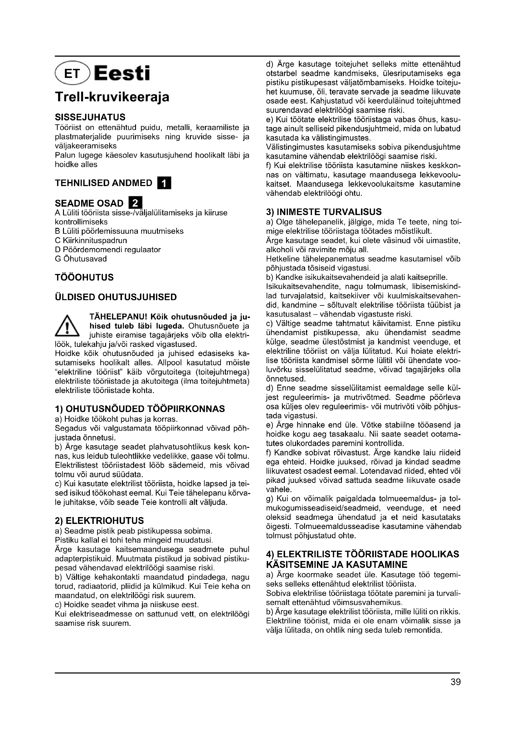 SEADME OSAD 2 A Lüliti tööriista sisse-/väljalülitamiseks ja kiiruse kontrollimiseks B Lüliti pöörlemissuuna muutmiseks C Kiirkinnituspadrun D Pöördemomendi regulaator G Õhutusavad TÖÖOHUTUS ÜLDISED OHUTUSJUHISED TÄHELEPANU! Kõik ohutusnõuded ja ju- hised tuleb läbi lugeda. Ohutusnõuete ja juhiste eiramise tagajärjeks võib olla elektri- löök, tulekahju ja/või rasked vigastused. Hoidke kõik ohutusnõuded ja juhised edasiseks ka- sutamiseks hoolikalt alles. Allpool kasutatud mõiste “elektriline tööriist” käib võrgutoitega (toitejuhtmega) elektriliste tööriistade ja akutoitega (ilma toitejuhtmeta) elektriliste tööriistade kohta.