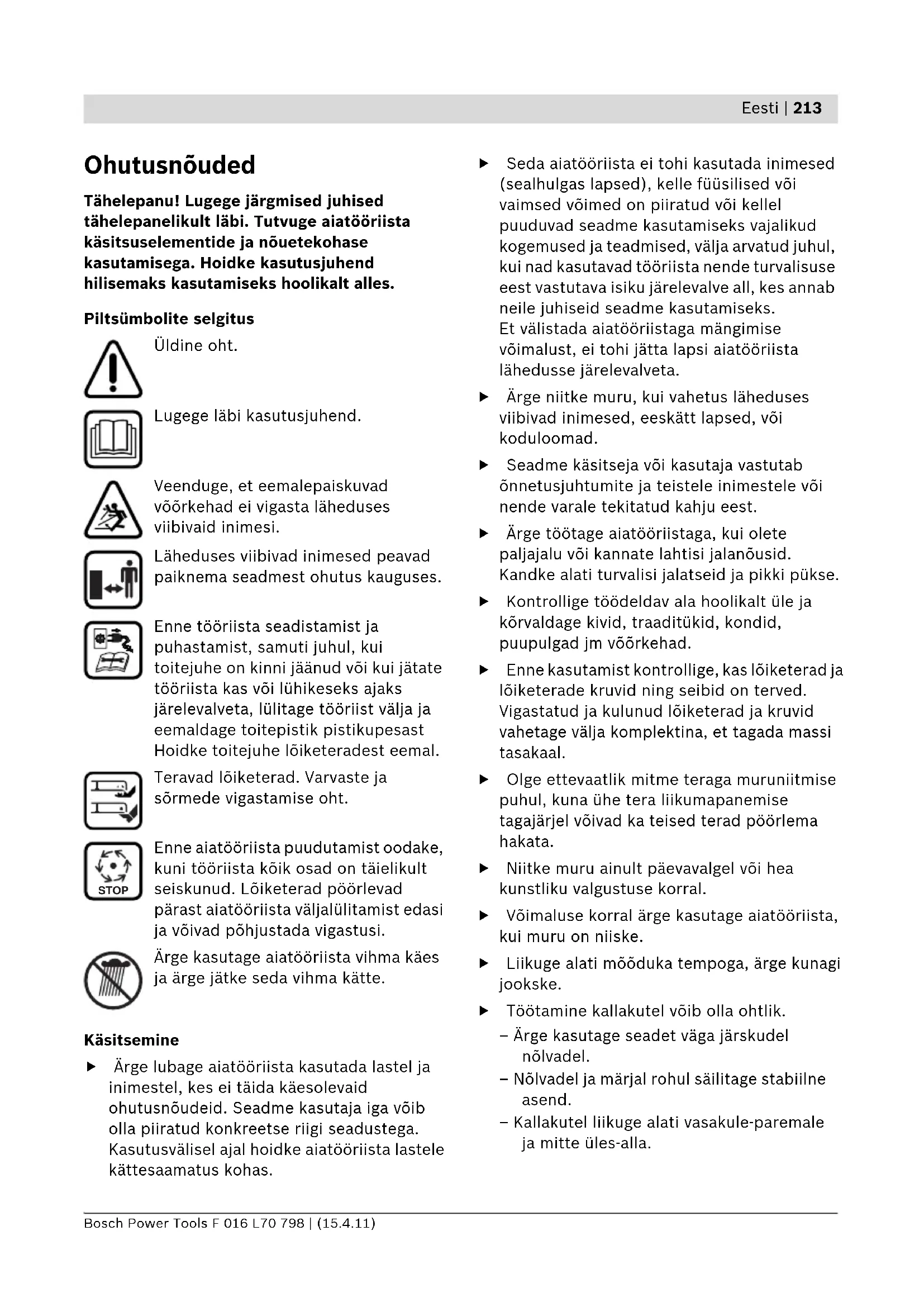 Ohutusnõuded Tähelepanu! Lugege järgmised juhised tähelepanelikult läbi. Tutvuge aiatööriista käsitsuselementide ja nõuetekohase kasutamisega. Hoidke kasutusjuhend hilisemaks kasutamiseks hoolikalt alles. Piltsümbolite selgitus Üldine oht. Lugege läbi kasutusjuhend. Veenduge, et eemalepaiskuvad võõrkehad ei vigasta läheduses viibivaid inimesi. Läheduses viibivad inimesed peavad paiknema seadmest ohutus kauguses. Enne tööriista seadistamist ja puhastamist, samuti juhul, kui toitejuhe on kinni jäänud või kui jätate tööriista kas või lühikeseks ajaks järelevalveta, lülitage tööriist välja ja eemaldage toitepistik pistikupesast Hoidke toitejuhe lõiketeradest eemal. Teravad lõiketerad. Varvaste ja sõrmede vigastamise oht. Enne aiatööriista puudutamist oodake, kuni tööriista kõik osad on täielikult seiskunud. Lõiketerad pöörlevad pärast aiatööriista väljalülitamist edasi ja võivad põhjustada vigastusi. Ärge kasutage aiatööriista vihma käes ja ärge jätke seda vihma kätte. Käsitsemine f Ärge lubage aiatööriista kasutada lastel ja inimestel, kes ei täida käesolevaid ohutusnõudeid. Seadme kasutaja iga võib olla piiratud konkreetse riigi seadustega. Kasutusvälisel ajal hoidke aiatööriista lastele kättesaamatus kohas. f Seda aiatööriista ei tohi kasutada inimesed (sealhulgas lapsed), kelle füüsilised või vaimsed võimed on piiratud või kellel puuduvad seadme kasutamiseks vajalikud kogemused ja teadmised, välja arvatud juhul, kui nad kasutavad tööriista nende turvalisuse eest vastutava isiku järelevalve all, kes annab neile juhiseid seadme kasutamiseks. Et välistada aiatööriistaga mängimise võimalust, ei tohi jätta lapsi aiatööriista lähedusse järelevalveta. f Ärge niitke muru, kui vahetus läheduses viibivad inimesed, eeskätt lapsed, või koduloomad. f Seadme käsitseja või kasutaja vastutab õnnetusjuhtumite ja teistele inimestele või nende varale tekitatud kahju eest. f Ärge töötage aiatööriistaga, kui olete paljajalu või kannate lahtisi jalanõusid. Kandke alati turvalisi jalatseid ja pikki pükse. f Kontrollige töödeldav ala hoolikalt üle ja kõrvaldage kivid, traaditükid, kondid, puupulgad jm võõrkehad. f Enne kasutamist kontrollige, kas lõiketerad ja lõiketerade kruvid ning seibid on terved. Vigastatud ja kulunud lõiketerad ja kruvid vahetage välja komplektina, et tagada massi tasakaal. f Olge ettevaatlik mitme teraga muruniitmise puhul, kuna ühe tera liikumapanemise tagajärjel võivad ka teised terad pöörlema hakata. f Niitke muru ainult päevavalgel või hea kunstliku valgustuse korral. f Võimaluse korral ärge kasutage aiatööriista, kui muru on niiske. f Liikuge alati mõõduka tempoga, ärge kunagi jookske. f Töötamine kallakutel võib olla ohtlik. – Ärge kasutage seadet väga järskudel nõlvadel. – Nõlvadel ja märjal rohul säilitage stabiilne asend. – Kallakutel liikuge alati vasakule-paremale ja mitte üles-alla. STOP OBJ_BUCH-1393-001.book Page 213 Friday, April 15, 2011 10:36 AM214 | Eesti F 016 L70 798 | (15.4.11) Bosch Power Tools – Nõlvadel suunda muutes olge äärmiselt ettevaatlik. – Aiatööriistaga tagurpidi liikudes või aiatööriista tõmmates olge äärmiselt ettevaatlik. – Niitmisel lükake aiatööriista alati ettepoole ja ärge tõmmake seda enda suunas. f Lõiketerad ei tohi liikuda, kui aiatööriista transportimiseks kallutate, kui sõidate üle alade, mis ei ole muruga kaetud, ning kui toimetate aiatööriista niidetavale alale või sealt ära. f Ärge kallutage aiatööriista mootori käivitamisel, välja arvatud juhul, kui see on vajalik kõrges rohus käivitamiseks. Sellisel juhul kergitage aiatööriista seda külge, mis ei jää kasutaja poole, vajutades käepidet alla vaid niipalju kui tingimata vajalik. Veenduge, et tagasi allalaskmisel hoiate aiatööriista käepidemest. f Lülitage aiatööriist kasutusjuhendis toodud viisil sisse ja veenduge, et Teie jalad on pöörlevatest osadest piisaval kaugusel. f Ärge viige oma käsi ja jalgu pöörlevate osade lähedusse või alla. f Aiatööriistaga töötades olge väljaviskeavast piisaval kaugusel. f Ärge kunagi tõstke ega kandke töötava mootoriga aiatööriista. f Ärge kasutage aiatööriista, kui kaitseseadised või katted, näiteks põrkekaitse ja/või rohukogumiskorv, on defektsed või puuduvad. f Muruniiduki seadistamisel olge eriti ettevaatlik, et vältida käte ja jalgade jäämist muruniiduki liikuvate ja jäikade osade vahele. f Hoidke toite- ja pikendusjuhe lõiketeradest eemal. Lõiketera võib juhtmeid vigastada, mistõttu võite kokku puutuda pingestatud osadega. Ettevaatust, elektrilöögi oht. Tõmmake võrgupistik pistikupesast välja: – alati, kui aiatööriista juurest lahkute, – enne kinnikiildumiste kõrvaldamist, – enne aiatööriista kontrollimist, puhastamist või seadistustööde tegemist, – pärast võõrkehaga kokkupuutumist. Kontrollige aiatööriista kohe kahjustuste suhtes ja laske see vajaduse korral parandada, – kui aiatööriist hakkab ebaharilikult vibreerima (kohe kontrollida). Vooluvõrguga ühendamine f Vooluallika pinge peab vastama aiatööriista andmesildil märgitud pingele. f Aiatööriista soovitame ühendada üksnes pistikupessa, mis on varustatud 30 mA käivitusvooluga rikkevoolukaitselülitiga. f Aiatööriista puhul kasutage vaid tootja andmetele vastavaid toitejuhtmeid; tellimisnumber ja tüüp on toodud kasutusjuhendis. f Ärge puudutage seadme võrgupistikut kunagi märgade kätega. f Ärge sõitke toitejuhtmest ega pikendusjuhtmest üle, ärge pigistage ega tõmmake seda, kuna see võib juhet vigastada. Kaitske toitejuhet kuumuse, õli ja teravate servade eest. f Pikendusjuhe peab olema kasutusjuhendis toodud ristlõikega ja pritsmekindel. Pistikühendus ei tohi olla vees. f Kandke alati aiakindaid, kui reguleerite seadet teravate lõiketerade piirkonnas. Hooldus f Kandke alati aiakindaid, kui reguleerite seadet tera
