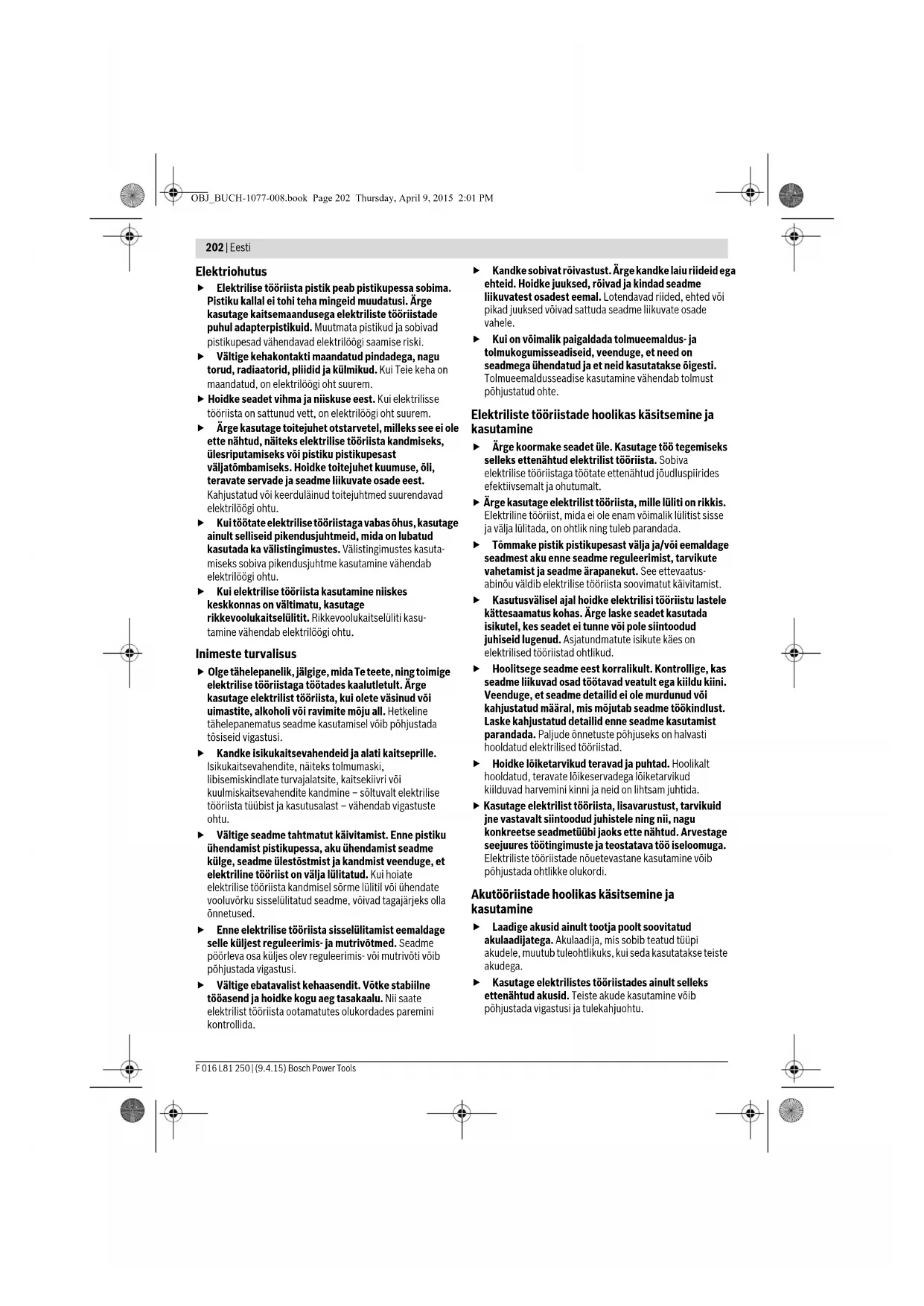 LED Kapacitet Stalno svijetli zeleno 35 – 100% Treperavo zeleno svjetlo 15 – 35% Treperavo crveno svjetlo 5 – 15% Stalno svijetli crveno 0 – 5% Simptomi Mogući uzroci Pomoć Suviše kratko trajanje rezanja po jednom punjenju aku-baterije Aku-baterija se približava završetku svojeg radnog vijeka trajanja Zatražiti pomoć ovlaštenog servisa Pokazivač punjenja aku-baterije stalno svijetli Nije moguć proces punjenja Neispravna aku-baterija Zatražiti pomoć ovlaštenog servisa OBJ_BUCH-1077-008.book Page 200 Thursday, April 9, 2015 2:01 PMEesti | 201 Bosch Power Tools F 016 L81 250 | (9.4.15) Servisiranje i savjetovanje o primjeni www.bosch-garden.com Za slučaj povratnih upita ili naručivanja rezervnih dijelova, molimo vas neizostavno navedite 10-znamenkasti kataloški broj sa tipske pločice električnog alata. Hrvatski Robert Bosch d.o.o Kneza Branimira 22 10040 Zagreb Tel.: (01) 2958051 Fax: (01) 2958050 Transport Li-ionske aku-baterije ugrađene u električnom alatu podliježu zakonu o transportu opasnih tvari. Aku-baterije korisnik može bez ikakvih preduvjeta transportirati cestovnim transportom. Ako transport obavlja treća strana (npr. transport zrakoplovom ili špedicijom), treba se pridržavati posebnih zahtjeva obzirom na ambalažu i označavanje. Kod pripreme ovakvih pošiljki za transport prethodno se treba savjetovati sa stručnjakom za transport opasnih tvari. Zbrinjavanje Vrtne uređaje, pribor i ambalažu treba dostaviti na ekološki prihvatljivo recikliranje. Vrtne uređaje, punjače i aku-bateriju/baterije ne bacajte u kućni otpad! Samo za zemlje EU: Prema Europskim smjernicama 2012/19/EU, neuporabivi električni i elektronički uređaji i prema Smjernicama 2006/66/EC neispravne ili istrošene aku- baterije/baterije moraju se odvojeno sakupljati i dovesti na ekološki prihvatljivo recikliranje. Integrirane aku-baterije smiju se izvaditi samo u svrhu zbrinjavanja. Otvaranjem kućišta vrtni uređaj se može uništiti. Za vađenje aku-baterije iz električnog alata pritišćite na tipku za uključivanje/isključivanje sve dok aku-baterija u potpunosti ne bude ispražnjena. Odvrnite vijke na kućištu i skinite oblogu kućišta kako biste izvadili akumulatorski paket. U svrhu izbjegavanja kratkog spoja, pojedinačno uzastopno odvajajte priključke na aku-bateriji te zatim na njima izolirajte polove. I kod potpunog pražnjenja, u aku-bateriji ostaje sačuvan preostali kapacitet koji se može osloboditi u slučaju kratkog spoja. Aku-baterije/baterije: Li-Ion: Molimo pridržavajte se napomena u odjeljku „Transport“. Zadržavamo pravo na promjene. Eesti Ohutusnõuded Piltsümbolite selgitus Kõik ohutusnõuded ja juhised tuleb läbi lugeda. Ohutusnõuete ja juhiste eiramise tagajärjeks võib olla elektrilöök, tulekahju ja/või rasked vigastused. Aiatööriistaga töötades kandke alati kaitseprille ja turvalisi jalatseid. Veenduge, et eemalepaiskuvad võõrkehad ei vigasta läheduses viibivaid inimesi. Hoiatus: Viibige töötavast aiatööriistast ohutus kauguses. Ärge kasutage aiatööriista vihma käes ja ärge jätke seda vihma kätte. Tähelepanu: Lõiketera ei seisku kohe pärast tööriista väljalülitamist! Laadimisseadet kasutage üksnes kuivades ruumides. Üldised ohutusjuhised Kõik ohutusnõuded ja juhised tuleb läbi lugeda. Ohutusnõuete ja juhiste eiramise tagajärjeks võib olla elektrilöök, tulekahju ja/või rasked vigastused. Hoidke kõik ohutusnõuded ja juhised edasiseks kasutamiseks hoolikalt alles. Allpool kasutatud mõiste „Elektriline tööriist“ käib võrgutoi- tega (toitejuhtmega) elektriliste tööriistade ja akutoitega (ilma toitejuhtmeta) elektriliste tööriistade kohta. Ohutusnõuded tööpiirkonnas Töökoht peab olema puhas ja hästi valgustatud. Töökohas valitsev segadus ja hämarus võib põhjustada õnnetusi. Ärge kasutage elektrilist tööriista plahvatusohtlikus keskkonnas, kus leidub tuleohtlikke vedelikke, gaase või tolmu. Elektrilistest tööriistadest lööb sädemeid, mis võivad tolmu või aurud süüdata. Elektrilise tööriista kasutamise ajal hoidke lapsed ja teised isikud töökohast eema. Kui Teie tähelepanu kõrvale juhitakse, võib seade Teie kontrolli alt väljuda. TÄHELEPANU OBJ_BUCH-1077-008.book Page 201 Thursday, April 9, 2015 2:01 PM202 | Eesti F 016 L81 250 | (9.4.15) Bosch Power Tools Elektriohutus Elektrilise tööriista pistik peab pistikupessa sobima. Pistiku kallal ei tohi teha mingeid muudatusi. Ärge kasutage kaitsemaandusega elektriliste tööriistade puhul adapterpistikuid. Muutmata pistikud ja sobivad pistikupesad vähendavad elektrilöögi saamise riski. Vältige kehakontakti maandatud pindadega, nagu torud, radiaatorid, pliidid ja külmikud. Kui Teie keha on maandatud, on elektrilöögi oht suurem. Hoidke seadet vihma ja niiskuse eest. Kui elektrilisse tööriista on sattunud vett, on elektrilöögi oht suurem. Ärge kasutage toitejuhet otstarvetel, milleks see ei ole ette nähtud, näiteks elektrilise tööriista kandmiseks, ülesriputamiseks või pistiku pistikupesast väljatõmbamiseks. Hoidke toitejuhet kuumuse, õli, teravate servade ja seadme liikuvate osade eest. Kahjustatud või keerduläinud toitejuhtmed suurendavad elektrilöögi ohtu. Kui töötate elektrilise tööriistaga vabas õhus, kasutage ainult selliseid pikendusjuhtmeid, mida on lubatud kasutada ka välistingimustes. Välistingimustes kasuta- miseks sobiva pikendusjuhtme kasutamine vähendab elektrilöögi ohtu. Kui elektrilise tööriista kasutamine niiskes keskkonnas on vältimatu, kasutage rikkevoolukaitselülitit. Rikkevoolukaitselüliti kasu- tamine vähendab elektrilöögi ohtu. Inimeste turvalisus Olge tähelepanelik, jälgige, mida Te teete, ning toimige elektrilise tööriistaga töötades kaalutletult. Ärge kasutage elektrilist tööriista, kui olete väsinud või uimastite, alkoholi või ravimite mõju all. Hetkeline tähelepanematus seadme kasutamisel võib põhjustada tõsiseid vigastusi. 