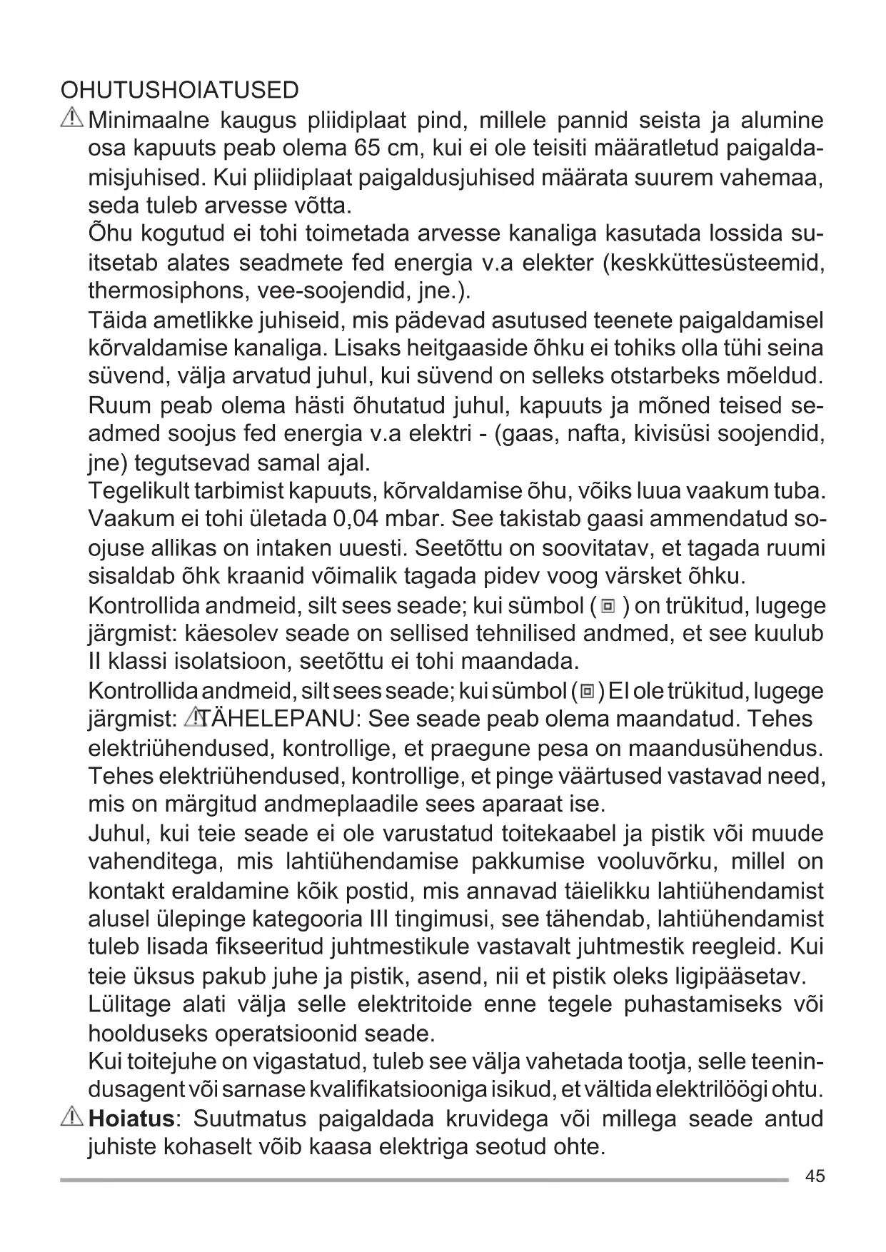 Внимание! Прежде прикасанием к лампочкам, убедитесь, что они остыли. Заменить на лампы того же типа (ø35, E14, 4W). ILCOS D code: DRBB/F-4-220-E14-37/10545 OHUTUSHOIATUSED Minimaalne kaugus pliidiplaat pind, millele pannid seista ja alumine osa kapuuts peab olema 65 cm, kui ei ole teisiti määratletud paigalda- misjuhised. Kui pliidiplaat paigaldusjuhised määrata suurem vahemaa, seda tuleb arvesse võtta. Õhu kogutud ei tohi toimetada arvesse kanaliga kasutada lossida su- itsetab alates seadmete fed energia v.a elekter (keskküttesüsteemid, thermosiphons, vee-soojendid, jne.). Täida ametlikke juhiseid, mis pädevad asutused teenete paigaldamisel kõrvaldamise kanaliga. Lisaks heitgaaside õhku ei tohiks olla tühi seina süvend, välja arvatud juhul, kui süvend on selleks otstarbeks mõeldud. Ruum peab olema hästi õhutatud juhul, kapuuts ja mõned teised se- admed soojus fed energia v.a elektri - (gaas, nafta, kivisüsi soojendid, jne) tegutsevad samal ajal. Tegelikult tarbimist kapuuts, kõrvaldamise õhu, võiks luua vaakum tuba. Vaakum ei tohi ületada 0,04 mbar. See takistab gaasi ammendatud so- ojuse allikas on intaken uuesti. Seetõttu on soovitatav, et tagada ruumi sisaldab õhk kraanid võimalik tagada pidev voog värsket õhku. Kontrollida andmeid, silt sees seade; kui sümbol ( ) on trükitud, lugege järgmist: käesolev seade on sellised tehnilised andmed, et see kuulub II klassi isolatsioon, seetõttu ei tohi maandada. Kontrollida andmeid, silt sees seade; kui sümbol ( ) EI ole trükitud, lugege järgmist: TÄHELEPANU: See seade peab olema maandatud. Tehes elektriühendused, kontrollige, et praegune pesa on maandusühendus. Tehes elektriühendused, kontrollige, et pinge väärtused vastavad need, mis on märgitud andmeplaadile sees aparaat ise. Juhul, kui teie seade ei ole varustatud toitekaabel ja pistik või muude vahenditega, mis lahtiühendamise pakkumise vooluvõrku, millel on kontakt eraldamine kõik postid, mis annavad täielikku lahtiühendamist alusel ülepinge kategooria III tingimusi, see tähendab, lahtiühendamist tuleb lisada fi kseeritud juhtmestikule vastavalt juhtmestik reegleid. Kui teie üksus pakub juhe ja pistik, asend, nii et pistik oleks ligipääsetav. Lülitage alati välja selle elektritoide enne tegele puhastamiseks või hoolduseks operatsioonid seade. Kui toitejuhe on vigastatud, tuleb see välja vahetada tootja, selle teenin- dusagent või sarnase kvalifi katsiooniga isikud, et vältida elektrilöögi ohtu. Hoiatus: Suutmatus paigaldada kruvidega või millega seade antud juhiste kohaselt võib kaasa elektriga seotud ohte.46 KASUTAMINE