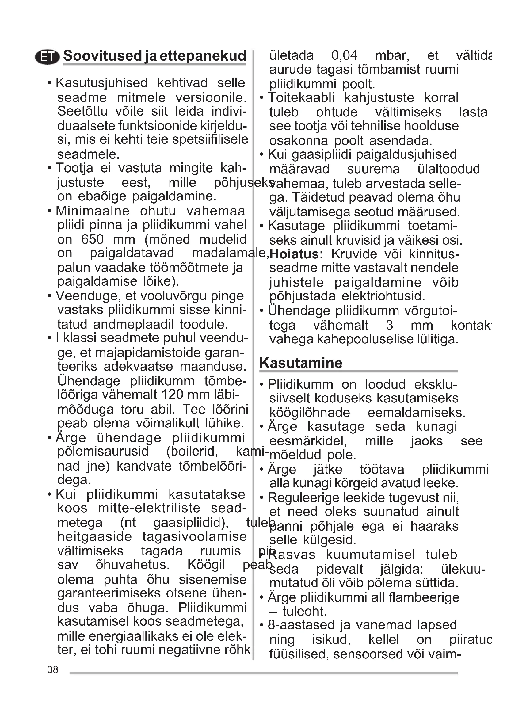 - Kui pliidikummi kasutatakse koos mitte-elektriliste sead- metega (nt gaasipliidid), tuleb heitgaaside tagasivoolamise vältimiseks tagada ruumis pii- sav õhuvahetus. Köögil peab olema puhta õhu sisenemise garanteerimiseks otsene ühen- dus vaba õhuga. Pliidikummi kasutamiselkoosseadmetega, mille energiaallikaks ei ole elek- ter,eitohiruuminegatiivnerõhk ületada 0,04 mbar, et vältida aurude tagasi tõmbamist ruumi pliidikummi poolt.