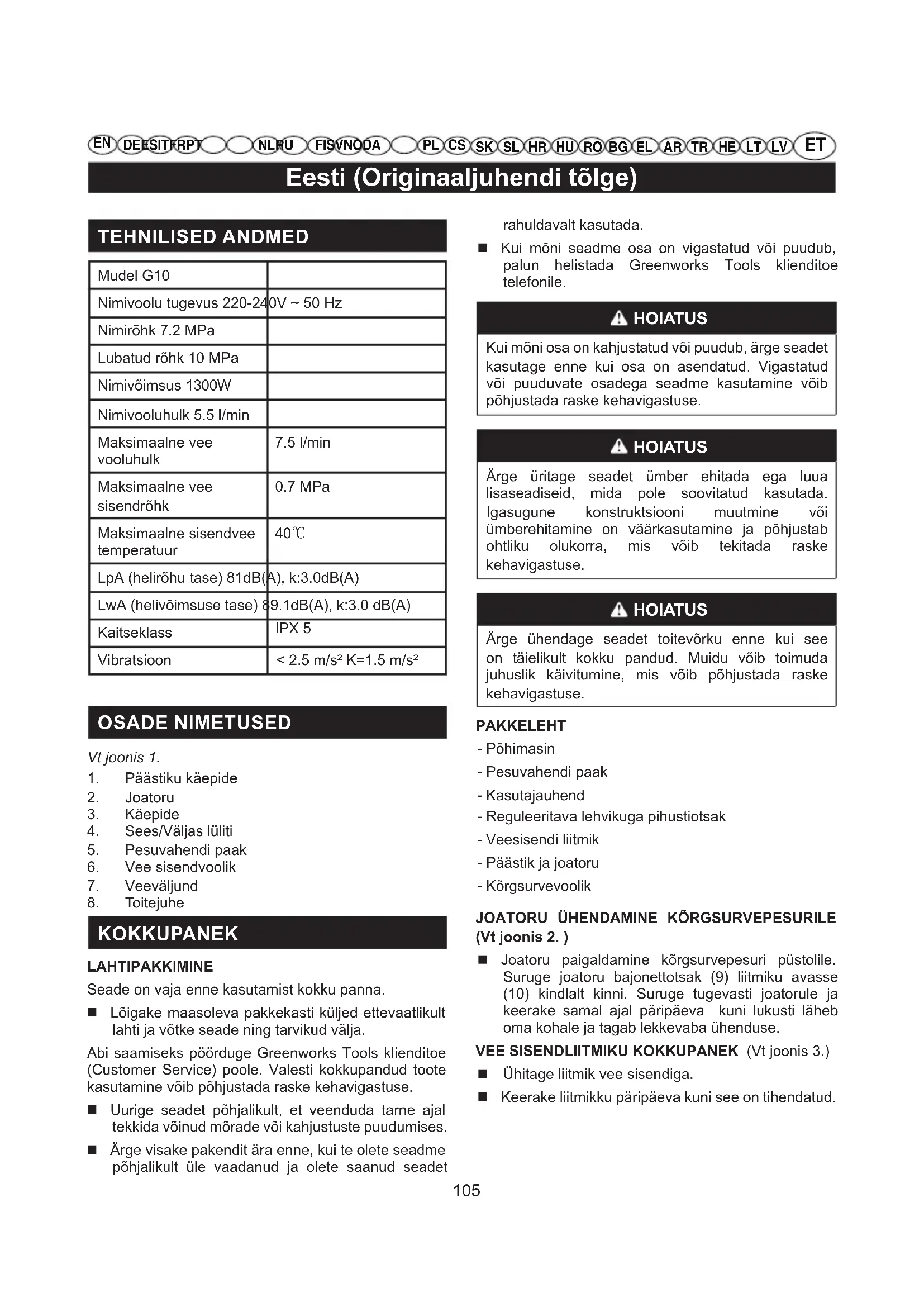 KOKKUPANEK LAHTIPAKKIMINE Seade on vaja enne kasutamist kokku panna. Lõigake maasoleva pakkekasti küljed ettevaatlikult lahti ja võtke seade ning tarvikud välja. Abi saamiseks pöörduge Greenworks Tools klienditoe (Customer Service) poole. Valesti kokkupandud toote kasutamine võib põhjustada raske kehavigastuse. Uurige seadet põhjalikult, et veenduda tarne ajal tekkida võinud mõrade või kahjustuste puudumises. Ärge visake pakendit ära enne, kui te olete seadme põhjalikult üle vaadanud ja olete saanud seadet rahuldavalt kasutada. Kui mõni seadme osa on vigastatud või puudub, palun helistada Greenworks Tools klienditoe telefonile. HOIATUS Kui mõni osa on kahjustatud või puudub, ärge seadet kasutage enne kui osa on asendatud. Vigastatud või puuduvate osadega seadme kasutamine võib põhjustada raske kehavigastuse. HOIATUS Ärge üritage seadet ümber ehitada ega luua lisaseadiseid, mida pole soovitatud kasutada. Igasugune konstruktsiooni muutmine või ümberehitamine on väärkasutamine ja põhjustab ohtliku olukorra, mis võib tekitada raske kehavigastuse. HOIATUS Ärge ühendage seadet toitevõrku enne kui see on täielikult kokku pandud. Muidu võib toimuda juhuslik käivitumine, mis võib põhjustada raske kehavigastuse. PAKKELEHT - Põhimasin - Pesuvahendi paak - Kasutajauhend - Reguleeritava lehvikuga pihustiotsak - Veesisendi liitmik - Päästik ja joatoru - Kõrgsurvevoolik