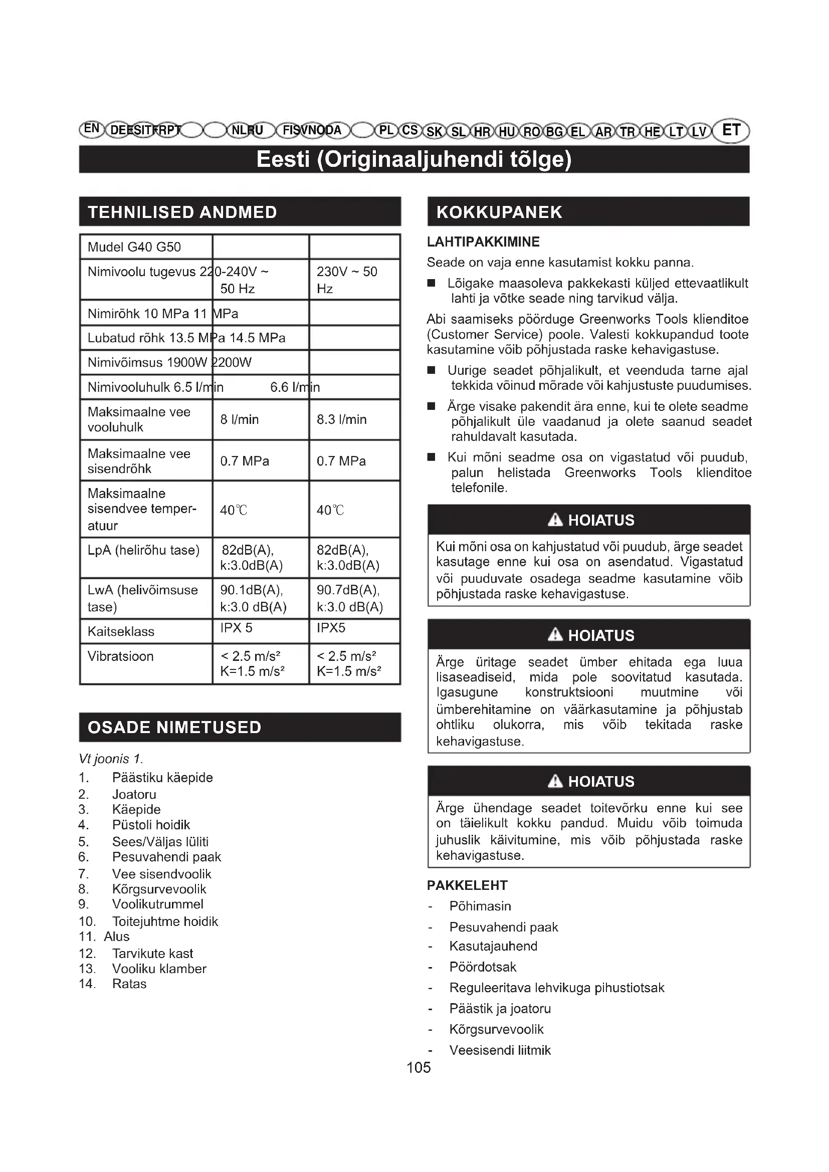 KOKKUPANEK LAHTIPAKKIMINE Seade on vaja enne kasutamist kokku panna. Lõigake maasoleva pakkekasti küljed ettevaatlikult lahti ja võtke seade ning tarvikud välja. Abi saamiseks pöörduge Greenworks Tools klienditoe (Customer Service) poole. Valesti kokkupandud toote kasutamine võib põhjustada raske kehavigastuse. Uurige seadet põhjalikult, et veenduda tarne ajal tekkida võinud mõrade või kahjustuste puudumises. Ärge visake pakendit ära enne, kui te olete seadme põhjalikult üle vaadanud ja olete saanud seadet rahuldavalt kasutada. Kui mõni seadme osa on vigastatud või puudub, palun helistada Greenworks Tools klienditoe telefonile. HOIATUS Kui mõni osa on kahjustatud või puudub, ärge seadet kasutage enne kui osa on asendatud. Vigastatud või puuduvate osadega seadme kasutamine võib põhjustada raske kehavigastuse. HOIATUS Ärge üritage seadet ümber ehitada ega luua lisaseadiseid, mida pole soovitatud kasutada. Igasugune konstruktsiooni muutmine või ümberehitamine on väärkasutamine ja põhjustab ohtliku olukorra, mis võib tekitada raske kehavigastuse. HOIATUS Ärge ühendage seadet toitevõrku enne kui see on täielikult kokku pandud. Muidu võib toimuda juhuslik käivitumine, mis võib põhjustada raske kehavigastuse. PAKKELEHT - Põhimasin - Pesuvahendi paak - Kasutajauhend - Pöördotsak - Reguleeritava lehvikuga pihustiotsak - Päästik ja joatoru - Kõrgsurvevoolik - Veesisendi liitmik106 Eesti (Originaaljuhendi tõlge)
