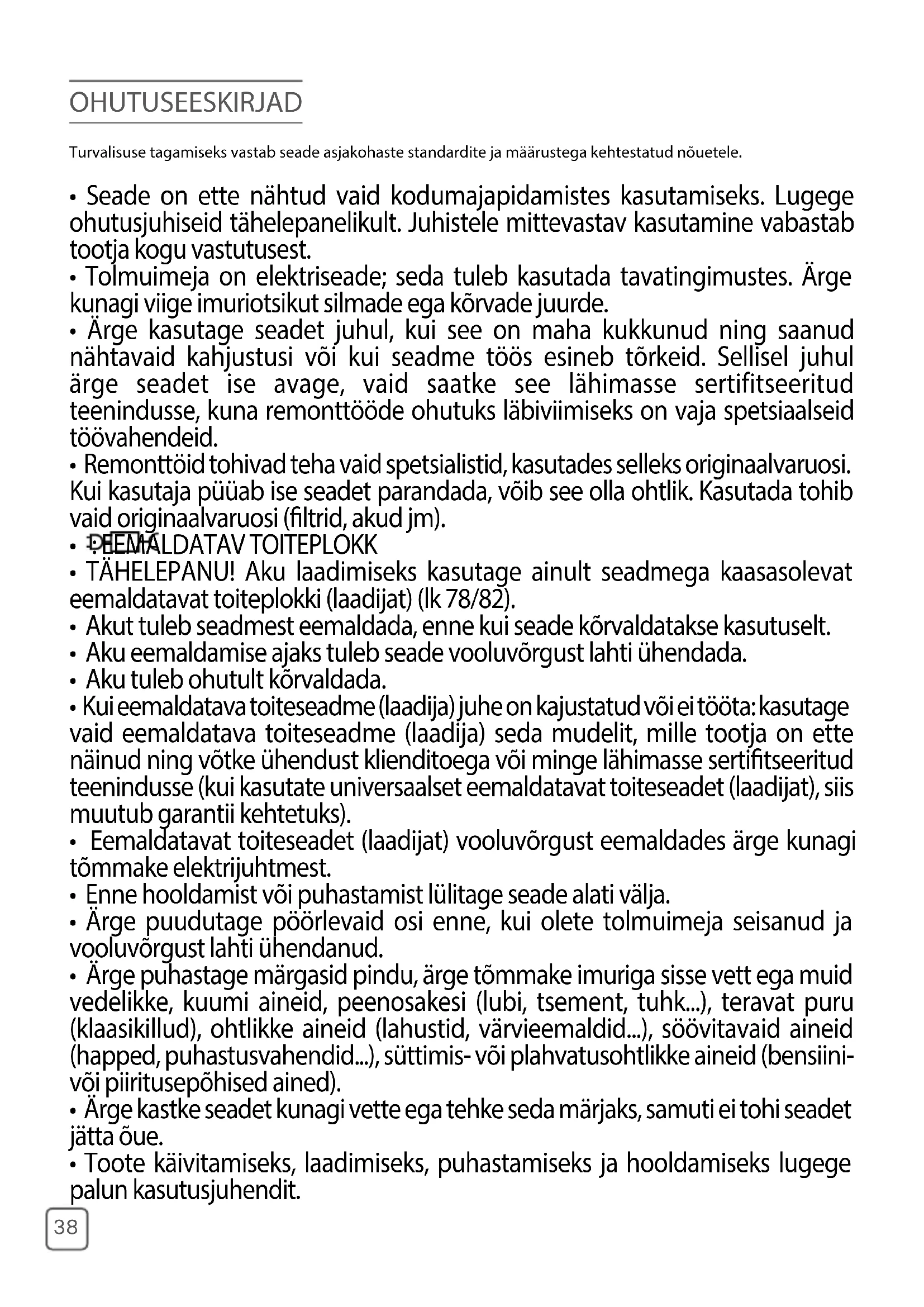 - Toote käivitamiseks, laadimiseks, puhastamiseks ja hooldamiseks lugege palun kasutusjuhendit.39
