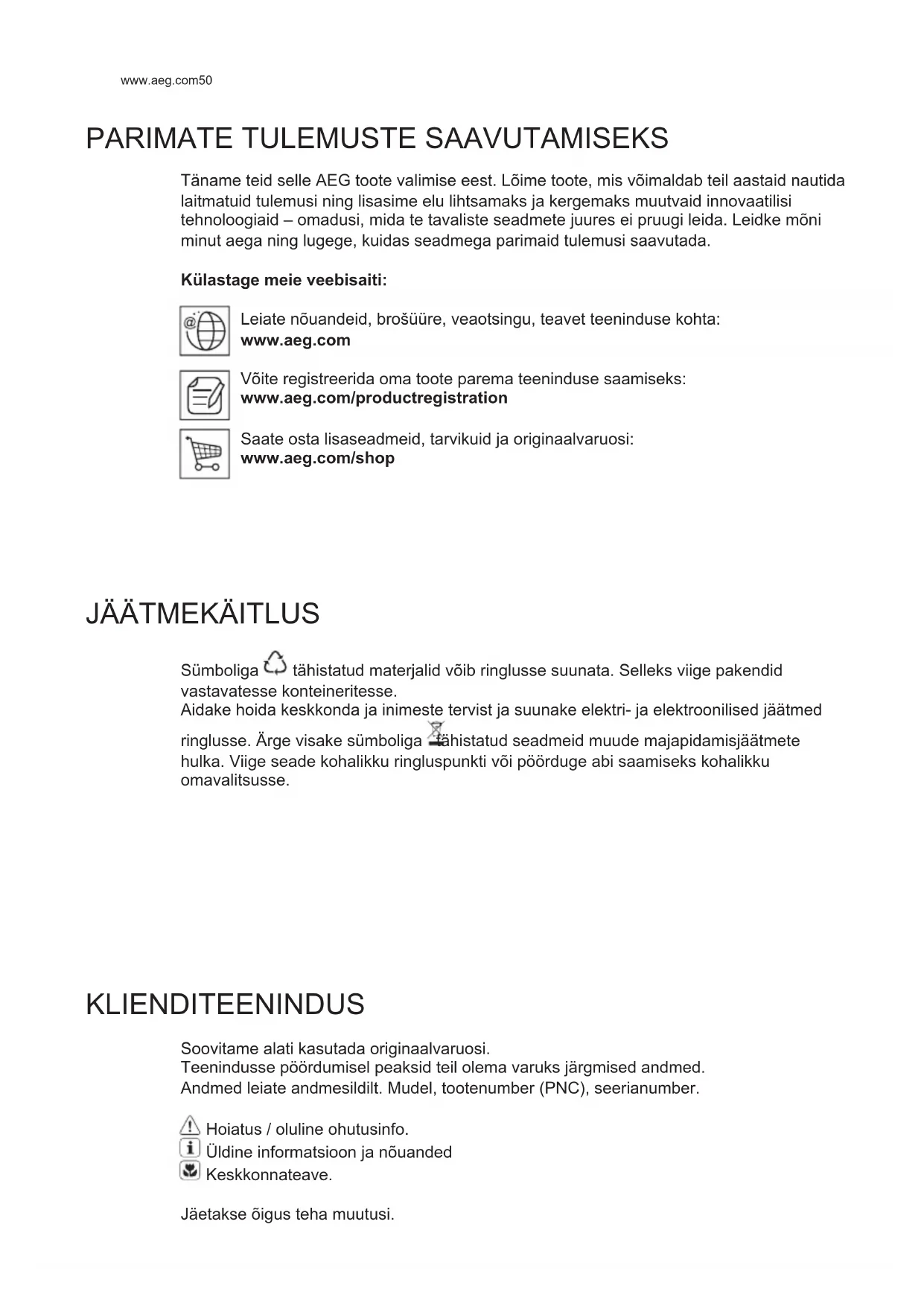 Sümboliga tähistatud materjalid võib ringlusse suunata. Selleks viige pakendid vastavatesse konteineritesse. Aidake hoida keskkonda ja inimeste tervist ja suunake elektri- ja elektroonilised jäätmed ringlusse. Ärge visake sümboliga tähistatud seadmeid muude majapidamisjäätmete hulka. Viige seade kohalikku ringluspunkti või pöörduge abi saamiseks kohalikku omavalitsusse. KLIENDITEENINDUS Soovitame alati kasutada originaalvaruosi. Teenindusse pöördumisel peaksid teil olema varuks järgmised andmed. Andmed leiate andmesildilt. Mudel, tootenumber (PNC), seerianumber. Hoiatus / oluline ohutusinfo. Üldine informatsioon ja nõuanded Keskkonnateave. Jäetakse õigus teha muutusi. ET KASUTUSJUHEND51 EESTI