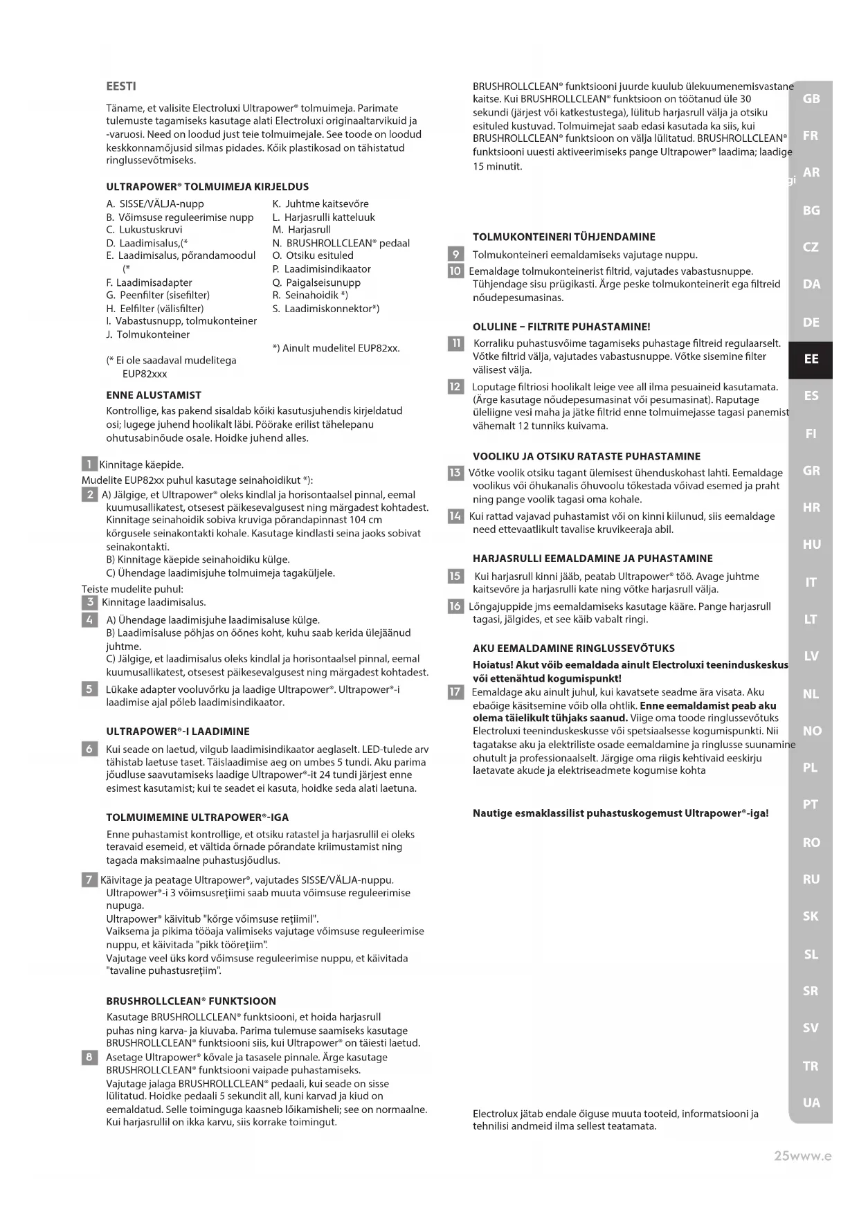 Hoiatus! Akut vőib eemaldada ainult Electroluxi teeninduskeskus vői ettenähtud kogumispunkt! 17 Eemaldage aku ainult juhul, kui kavatsete seadme ära visata. Aku ebaőige käsitsemine vőib olla ohtlik. Enne eemaldamist peab aku olema täielikult tühjaks saanud. Viige oma toode ringlussevőtuks Electroluxi teeninduskeskusse vői spetsiaalsesse kogumispunkti. Nii tagatakse aku ja elektriliste osade eemaldamine ja ringlusse suunamine ohutult ja professionaalselt. Järgige oma riigis kehtivaid eeskirju laetavate akude ja elektriseadmete kogumise kohta Nautige esmaklassilist puhastuskogemust Ultrapower®-iga!26www.electrolux.com