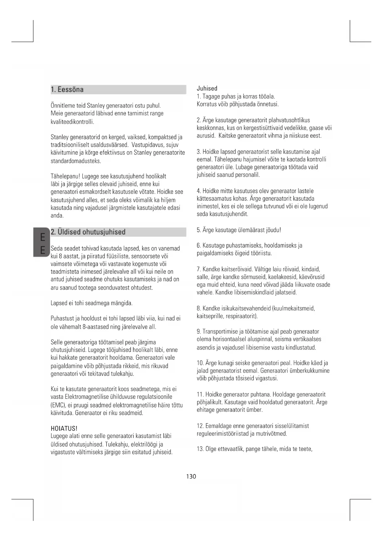 Õnnitleme teid Stanley generaatori ostu puhul. Meie generaatorid läbivad enne tarnimist range kvaliteedikontrolli. Stanley generaatorid on kerged, vaiksed, kompaktsed ja traditsiooniliselt usaldusväärsed. Vastupidavus, sujuv käivitumine ja kõrge efektiivsus on Stanley generaatorite standardomadusteks. Tähelepanu! Lugege see kasutusjuhend hoolikalt läbi ja järgige selles olevaid juhiseid, enne kui generaatori esmakordselt kasutusele võtate. Hoidke see kasutusjuhend alles, et seda oleks võimalik ka hiljem kasutada ning vajadusel järgmistele kasutajatele edasi anda.