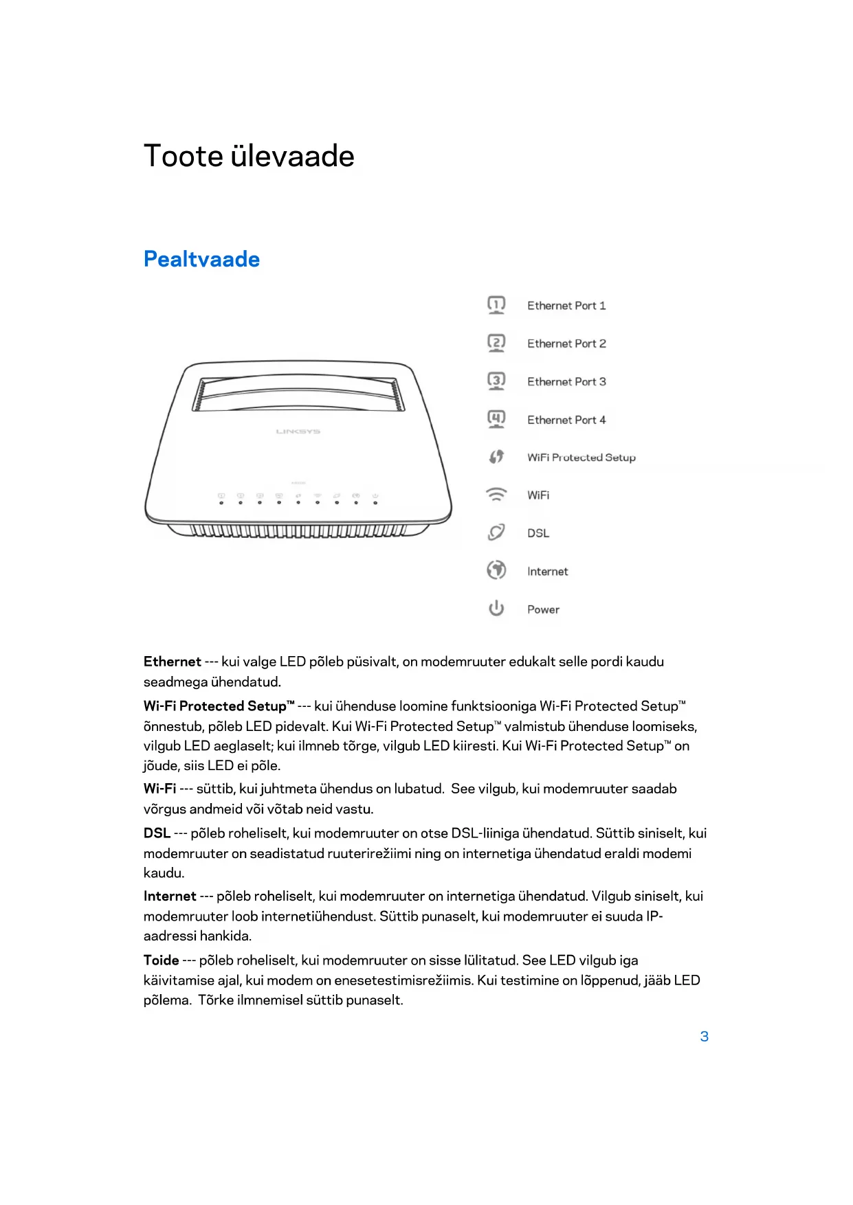Ethernet --- kui valge LED põleb püsivalt, on modemruuter edukalt selle pordi kaudu seadmega ühendatud. Wi-Fi Protected Setup™ --- kui ühenduse loomine funktsiooniga Wi-Fi Protected Setup™ õnnestub, põleb LED pidevalt. Kui Wi-Fi Protected Setup™ valmistub ühenduse loomiseks, vilgub LED aeglaselt; kui ilmneb tõrge, vilgub LED kiiresti. Kui Wi-Fi Protected Setup™ on jõude, siis LED ei põle. Wi-Fi --- süttib, kui juhtmeta ühendus on lubatud. See vilgub, kui modemruuter saadab võrgus andmeid või võtab neid vastu. DSL --- põleb roheliselt, kui modemruuter on otse DSL-liiniga ühendatud. Süttib siniselt, kui modemruuter on seadistatud ruuterirežiimi ning on internetiga ühendatud eraldi modemi kaudu. Internet --- põleb roheliselt, kui modemruuter on internetiga ühendatud. Vilgub siniselt, kui modemruuter loob internetiühendust. Süttib punaselt, kui modemruuter ei suuda IP- aadressi hankida. Toide --- põleb roheliselt, kui modemruuter on sisse lülitatud. See LED vilgub iga käivitamise ajal, kui modem on enesetestimisrežiimis. Kui testimine on lõppenud, jääb LED põlema. Tõrke ilmnemisel süttib punaselt.4 Tagasi