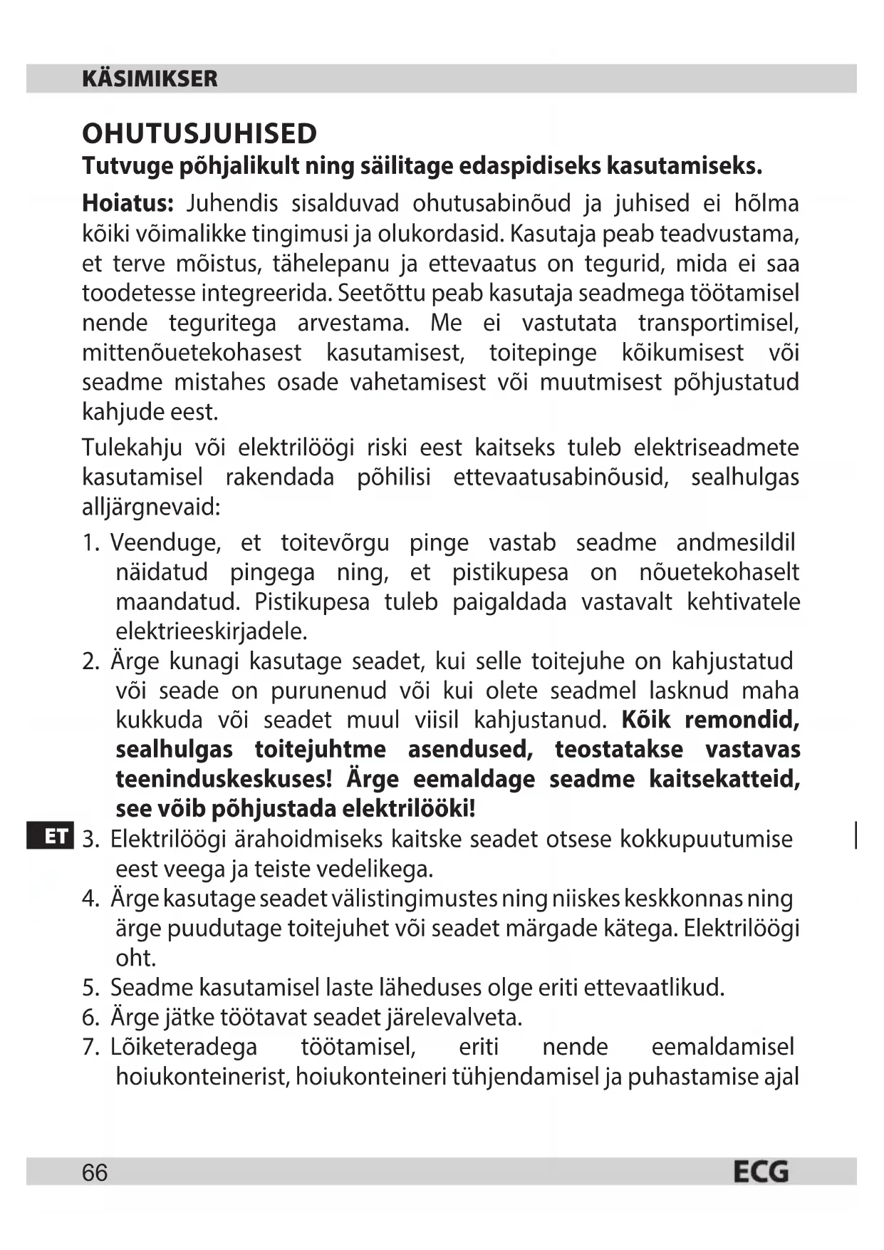seadet ja selle toitejuhet lastele kättesaamatult. Seadet võivad kasutada lapsed ja puudulike füüsiliste või vaimsete võimetega või ebapiisavate teadmistega või kogemustega isikud tingimusel, et nad on järelevalve all ning neile on selgitatud seadme ohutut kasutamist ning nad on teadlikud potentsiaalsetest riskidest. Ärge lubage lastel seadmega mängida. Do not immerse in water! – Ärge sukeldage vette! OHT lastele: Lapsed ei tohi pakkematerjaliga mängida. Ärge lubage lastel mängida plastkottidega. Lämbumise oht.