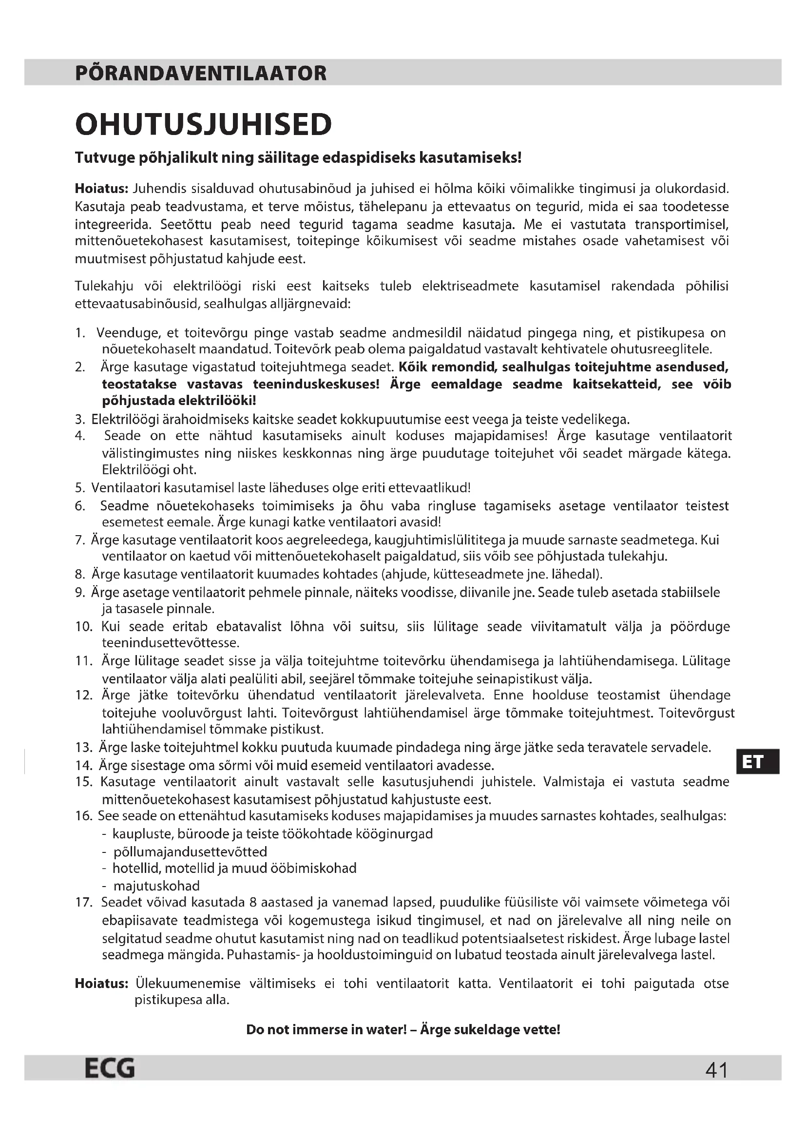 ebapiisavate teadmistega või kogemustega isikud tingimusel, et nad on järelevalve all ning neile on selgitatud seadme ohutut kasutamist ning nad on teadlikud potentsiaalsetest riskidest. Ärge lubage lastel seadmega mängida. Puhastamis- ja hooldustoiminguid on lubatud teostada ainult järelevalvega lastel. Hoiatus: Ülekuumenemise vältimiseks ei tohi ventilaatorit katta. Ventilaatorit ei tohi paigutada otse pistikupesa alla. Do not immerse in water! – Ärge sukeldage vette!ET