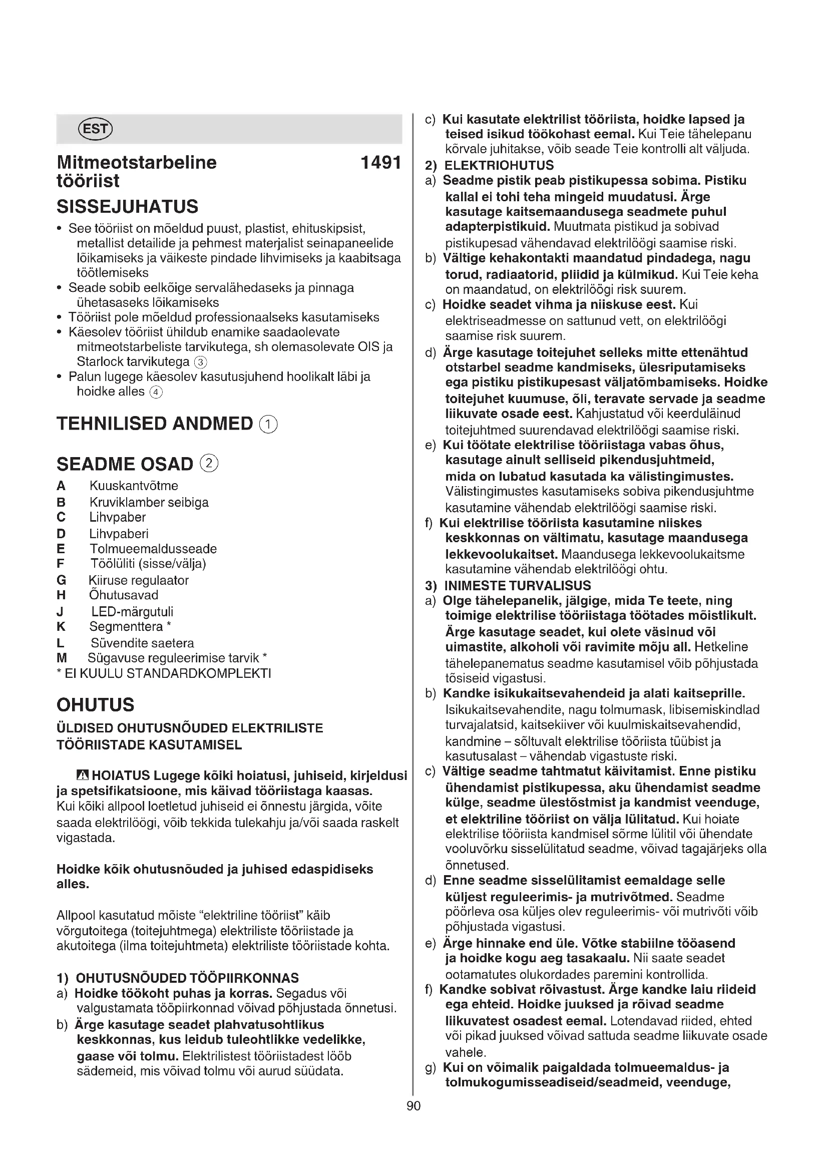 a) Hoidke töökoht puhas ja korras. Segadus või valgustamata tööpiirkonnad võivad põhjustada õnnetusi. b) Ärge kasutage seadet plahvatusohtlikus keskkonnas, kus leidub tuleohtlikke vedelikke, gaase või tolmu. Elektrilistest tööriistadest lööb sädemeid, mis võivad tolmu või aurud süüdata.91