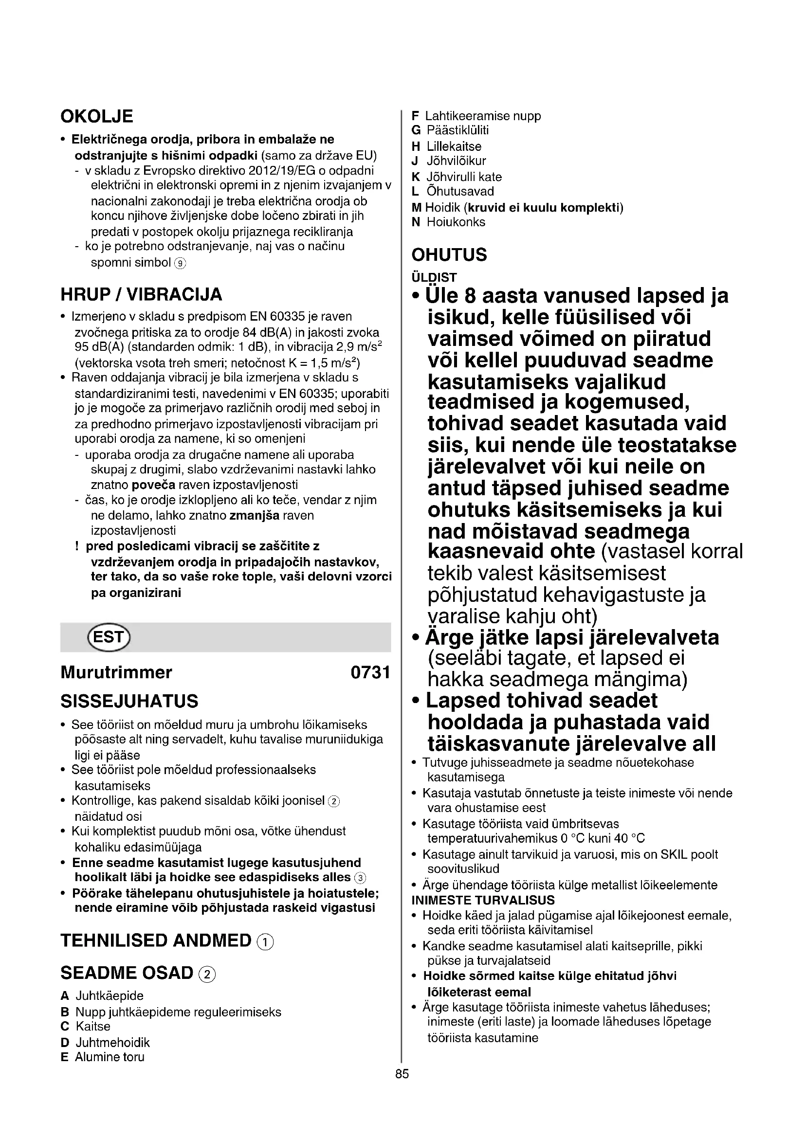 - Pöörake tähelepanu ohutusjuhistele ja hoiatustele; nende eiramine võib põhjustada raskeid vigastusi TEHNILISED ANDMED 1 SEADME OSAD 2 A Juhtkäepide B Nupp juhtkäepideme reguleerimiseks C Kaitse D Juhtmehoidik E Alumine toru F Lahtikeeramise nupp G Päästiklüliti H Lillekaitse J Jõhvilõikur K Jõhvirulli kate L Õhutusavad M Hoidik (kruvid ei kuulu komplekti) N Hoiukonks OHUTUS ÜLDIST