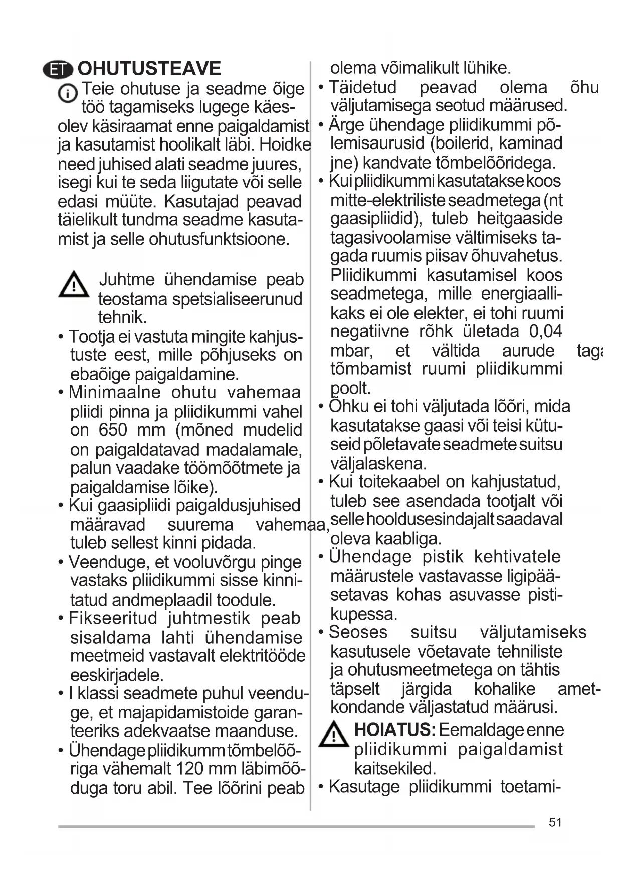 - Pliidikummi kasutamisel sama- aegselt gaasi või teisi kütuseid põletavate seadmetega peab olema tagatud ruumi piisav venti- latsioon (ei rakendu seadmetele, misväljutavadõhuainulttagasi ruumi).