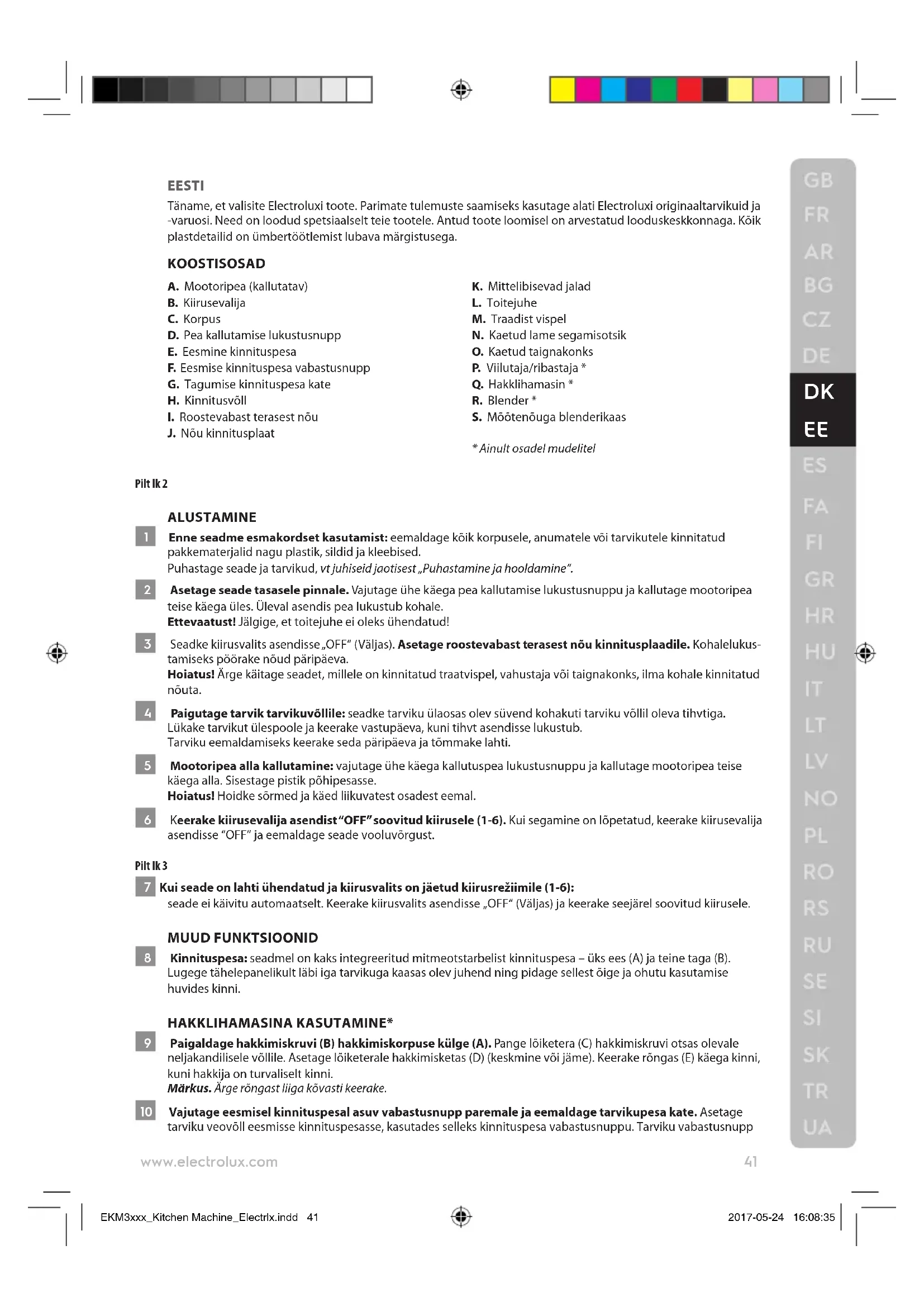 See tootel asuv sümbol näitab, et tootes on aku, mida ei tohi visata ära koos tavalise olmeprügiga. See tootel või selle pakendil olev sümbol näitab, et toodet ei tohi käsitleda olmeprügina. Viige toode ümberkäitlemiseks ametlikku kogumispunkti või Electroluxi teeninduskeskusesse, kus aku ja elektriosad suudetakse turvaliselt ja professionaalselt eemaldada. Järgige oma riigi elektritoodete ja akude eraldi kogumist käsitlevaid reegleid. Electrolux jätab endale õiguse muuta ilma sellest ette teatamata tooteid, teavet ja tehnilisi andmeid. EKM3xxx_Kitchen Machine_Electrlx.indd 44 2017-05-24 16:08:3545 www.electrolux.com