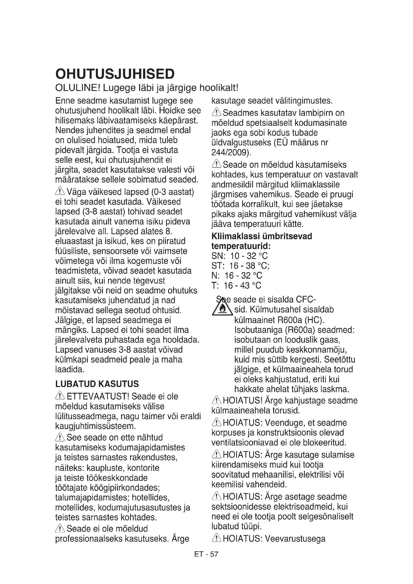 COMPARTIMENTOS Acerca de los estantes de cristal del congelador: Cuando el congelador está desempacado, los dos estantes de vidrio del congelador pueden estar en la posición de estante inferior del congelador. En esta situación, retire el estante más grande y colóquelo en la posición del estante superior. Esta presentación es sólo para información sobre las piezas del aparato. Las piezas pueden variar según el modelo del aparato Solapa superior del congelador / Cajón superior del congelador Mando del termostato Bandeja para hielo Hoja de hielo de plástico Estantes de cristal del congelador Compartimento congelador los cajones Pies niveladoresET - 57 OHUTUSJUHISED OLULINE! Lugege läbi ja järgige hoolikalt! Enne seadme kasutamist lugege see ohutusjuhend hoolikalt läbi. Hoidke see hilisemaks läbivaatamiseks käepärast. Nendes juhendites ja seadmel endal on olulised hoiatused, mida tuleb pidevalt järgida. Tootja ei vastuta selle eest, kui ohutusjuhendit ei järgita, seadet kasutatakse valesti või määratakse sellele sobimatud seaded. Väga väikesed lapsed (0-3 aastat) ei tohi seadet kasutada. Väikesed lapsed (3-8 aastat) tohivad seadet kasutada ainult vanema isiku pideva järelevalve all. Lapsed alates 8. eluaastast ja isikud, kes on piiratud füüsiliste, sensoorsete või vaimsete võimetega või ilma kogemuste või teadmisteta, võivad seadet kasutada ainult siis, kui nende tegevust jälgitakse või neid on seadme ohutuks kasutamiseks juhendatud ja nad mõistavad sellega seotud ohtusid. Jälgige, et lapsed seadmega ei mängiks. Lapsed ei tohi seadet ilma järelevalveta puhastada ega hooldada. Lapsed vanuses 3-8 aastat võivad külmkapi seadmeid peale ja maha laadida. LUBATUD KASUTUS ETTEVAATUST! Seade ei ole mõeldud kasutamiseks välise lülitusseadmega, nagu taimer või eraldi kaugjuhtimissüsteem. See seade on ette nähtud kasutamiseks kodumajapidamistes ja teistes sarnastes rakendustes, näiteks: kaupluste, kontorite ja teiste töökeskkondade töötajate köögipiirkondades; talumajapidamistes; hotellides, motellides, kodumajutusasutustes ja teistes sarnastes kohtades. Seade ei ole mõeldud professionaalseks kasutuseks. Ärge kasutage seadet välitingimustes. Seadmes kasutatav lambipirn on mõeldud spetsiaalselt kodumasinate jaoks ega sobi kodus tubade üldvalgustuseks (EÜ määrus nr 244/2009). Seade on mõeldud kasutamiseks kohtades, kus temperatuur on vastavalt andmesildil märgitud kliimaklassile järgmises vahemikus. Seade ei pruugi töötada korralikult, kui see jäetakse pikaks ajaks märgitud vahemikust välja jääva temperatuuri kätte. Kliimaklassi ümbritsevad temperatuurid: SN: 10 - 32 °C ST: 16 - 38 °C; N: 16 - 32 °C T: 16 - 43 °C See seade ei sisalda CFC- sid. Külmutusahel sisaldab külmaainet R600a (HC). Isobutaaniga (R600a) seadmed: isobutaan on looduslik gaas, millel puudub keskkonnamõju, kuid mis süttib kergesti. Seetõttu jälgige, et külmaaineahela torud ei oleks kahjustatud, eriti kui hakkate ahelat tühjaks laskma. HOIATUS! Ärge kahjustage seadme külmaaineahela torusid. HOIATUS: Veenduge, et seadme korpuses ja konstruktsioonis olevad ventilatsiooniavad ei ole blokeeritud. HOIATUS: Ärge kasutage sulamise kiirendamiseks muid kui tootja soovitatud mehaanilisi, elektrilisi või keemilisi vahendeid. HOIATUS: Ärge asetage seadme sektsioonidesse elektriseadmeid, kui need ei ole tootja poolt selgesõnaliselt lubatud tüüpi. HOIATUS: VeevarustusegaET - 58 mitteühendatud jäävalmistajaid ja/ või veeautomaate võib täita ainult joogiveega. HOIATUS: Automaatsed jäävalmistajad ja/või veeautomaadid tohib ühendada ainult joogiveetorustikuga, kus veesurve on vahemikus 0,17-0,81 mPa (1,7-8,1 bar). Ärge hoidke seadmes ega selle lähedal plahvatusohtlikke aineid, näiteks aerosoolipurke, bensiini ja muid tuleohtlikke aineid. Ärge neelake (mõne mudeliga kaasasolevate) jääpakkide sisu (mittemürgine). Ärge sööge jääkuubikuid või jääpulki kohe pärast nende sügavkülmikust võtmist, sest need võivad põhjustada külmapõletust. Toodetel, millel on ette nähtud õhultri kasutamine ligipääsetava ventilaatorikatte sees, peab lter asuma seadme töötamise ajal alati ettenähtud kohal. Ärge hoidke külmutussektsioonis vedelikega klaasnõusid, sest need võivad puruneda! Ärge blokeerige ventilaatorit (kui see on paigaldatud) toiduainetega. Pärast toidu paigutamist kontrollige, et sügavkülmiku uks oleks korralikult kinni. Kahjustatud tihend tuleb võimalikult kiiresti välja vahetada. Kasutage sügavkülmikut ainult külmutatud toidu hoidmiseks, värske toidu külmutamiseks ja jääkuubikute tegemiseks. Vältige katmata toidu hoidmist otseses kontaktis külmutussektsioonide sisepindadega. C-pentaani kasutatakse isolatsioonivahus puhumisvahendina ja see on kergesti süttiv gaas. Kõige sobilikumad seadme sektsioonid, kus säilitada teatud tüüpi toiduaineid, võttes arvesse erinevat temperatuurijaotust erinevates seadme sektsioonides, on jaotatud järgnevalt: 4 tärni tsooni (****) sektsioon on sobilik toatemperatuuril olevate toiduainete külmutamiseks ning külmutatud toidu hoiustamiseks, kuna sealne temperatuur on ühtlaselt terves sektsioonis jagunenud. Ostetud külmutatud toidul on pakendil märgitud selle säilivusaeg. See võtab arvesse hoiustatava toiduaine tüüpi ning seega peaks seda kuupäeva arvesse võtma. Värsket toitu tohib säilitada järgmiste ajaperioodide jooksul: 1-3 kuud juustu, koorikloomade, jäätise, singi/vorstide, piima, värskete vedelike jaoks; 4 kuud praetüki või karbonaadi (loom, lammas, siga) jaoks; 6 kuud või/margariini, linnuliha (kana, kalkun) jaoks; 8-12 puuviljade (va.tsiruselised), praeliha (loomaliha, siga, lammas), köögiviljad, jaoks. 2 tärni tsoonis olevate pakendatud toiduainete aegumiskuupäevasid tuleks hoolikalt järgida. Toidu saastumise vältimisks järgige palun järgmist: - Ukse avamine pikkadeks perioodideks võib põhjustada märkimisväärset temperatuuri tõusu sead