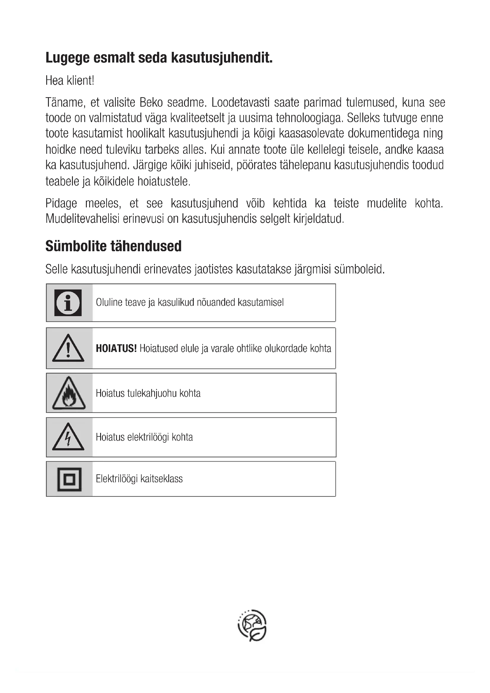 Отстраняване на неизправностиLugege esmalt seda kasutusjuhendit. Hea klient! Täname, et valisite Beko seadme. Loodetavasti saate parimad tulemused, kuna see toode on valmistatud väga kvaliteetselt ja uusima tehnoloogiaga. Selleks tutvuge enne toote kasutamist hoolikalt kasutusjuhendi ja kõigi kaasasolevate dokumentidega ning hoidke need tuleviku tarbeks alles. Kui annate toote üle kellelegi teisele, andke kaasa ka kasutusjuhend. Järgige kõiki juhiseid, pöörates tähelepanu kasutusjuhendis toodud teabele ja kõikidele hoiatustele. Pidage meeles, et see kasutusjuhend võib kehtida ka teiste mudelite kohta. Mudelitevahelisi erinevusi on kasutusjuhendis selgelt kirjeldatud. Sümbolite tähendused Selle kasutusjuhendi erinevates jaotistes kasutatakse järgmisi sümboleid.