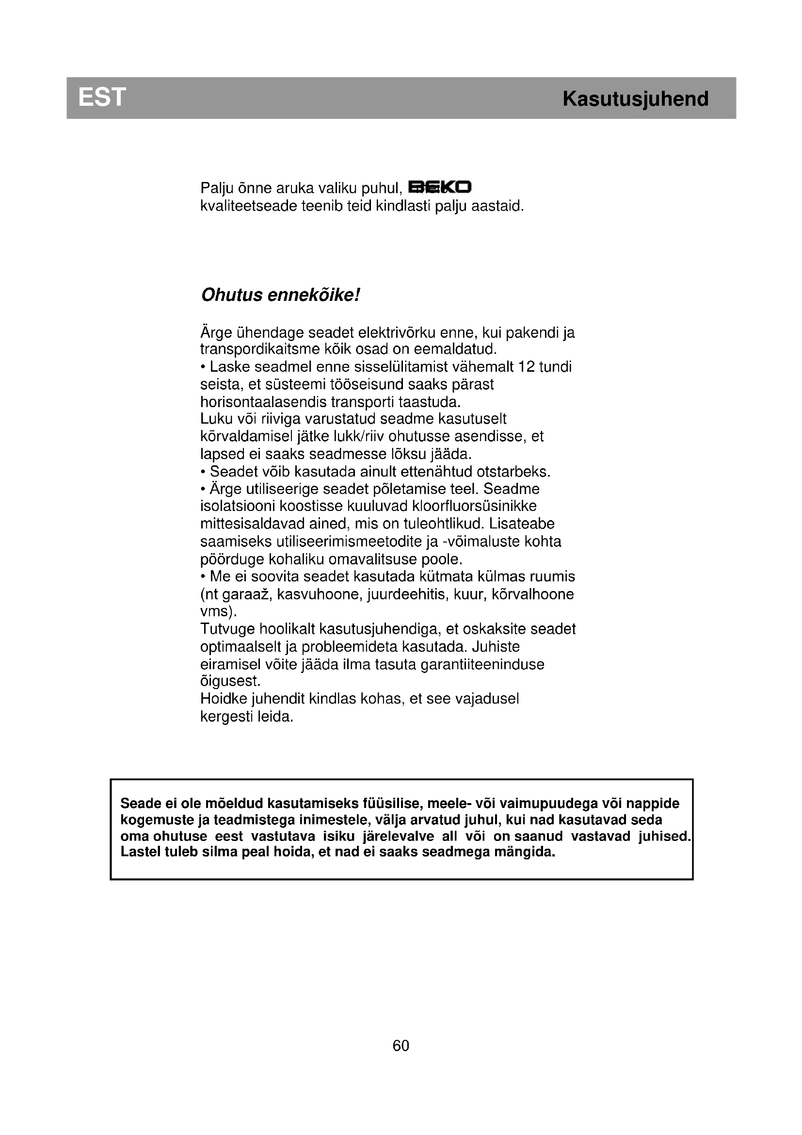Seade ei ole mõeldud kasutamiseks füüsilise, meele- või vaimupuudega või nappide kogemuste ja teadmistega inimestele, välja arvatud juhul, kui nad kasutavad seda oma ohutuse eest vastutava isiku järelevalve all või on saanud vastavad juhised. Lastel tuleb silma peal hoida, et nad ei saaks seadmega mängida.EST Kasutusjuhend Elektriohutus Enne seadme vooluvõrku ühendamist kontrollige, kas seadme sees paiknevale andmesildile märgitud toitepinge ja sagedus vastavad vooluvõrgu näitajatele. Soovitame ühendada seadme vooluvõrku sobivas kohas paikneva kaitsmega varustatud seinakontakti kaudu. Hoiatus! Seade peab olema maandatud. Elektriseadmete remondiga võivad tegelda ainult kvalifitseeritud spetsialistid. Kvalifitseerimata isiku tehtud oskamatu remont võib põhjustada ohte, mis võivad seadme kasutajat tõsiselt kahjustada. TÄHELEPANU! Seadmes on kasutusel külmutusagens R600a, mis on keskkonnasõbralik, kuid tuleohtlik gaas. Toodet tuleb transportida ja paigaldada ettevaatlikult, et mitte kahjustada jahutussüsteemi. Kui jahutussüsteem on viga saanud ja on tekkinud gaasileke, hoidke toodet eemal lahtistest leekidest ja tuulutage veidi aega ruumi. HOIATUS: ärge kasutage sulatusprotsessi kiirendamiseks mehaanilisi vms abivahendeid peale tootja soovitatute. HOIATUS: ärge kahjustage külmutusagensikontuuri. HOIATUS: ärge kasutage toiduainete hoiukambrites elektriseadmeid, välja arvatud tootja soovitatud seadmetüübid. HOIATUS: ohtude vältimiseks peab defektse toitejuhtme välja vahetama tootja, volitatud teenindus või samaväärse kvalifikatsiooniga isik. Transpordieeskirjad