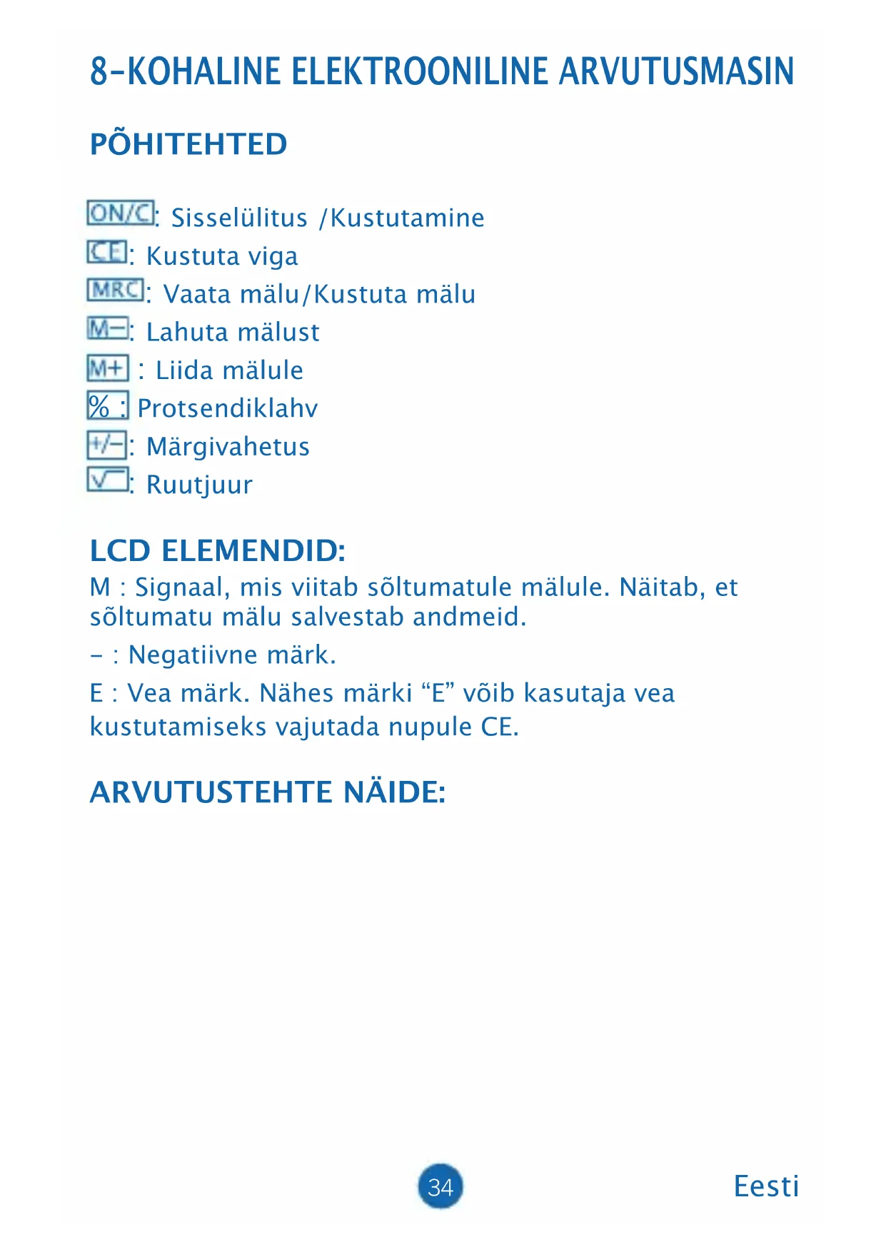 PÕHITEHTED : Sisselülitus /Kustutamine : Kustuta viga : Vaata mälu/Kustuta mälu : Lahuta mälust : Liida mälule % : Protsendiklahv : Märgivahetus : Ruutjuur LCD ELEMENDID: M : Signaal, mis viitab sõltumatule mälule. Näitab, et sõltumatu mälu salvestab andmeid. - : Negatiivne märk. E : Vea märk. Nähes märki “E” võib kasutaja vea kustutamiseks vajutada nupule CE. ARVUTUSTEHTE NÄIDE: Eesti35 ON/C 5+6M 32-6M+ 36+17M- MRC