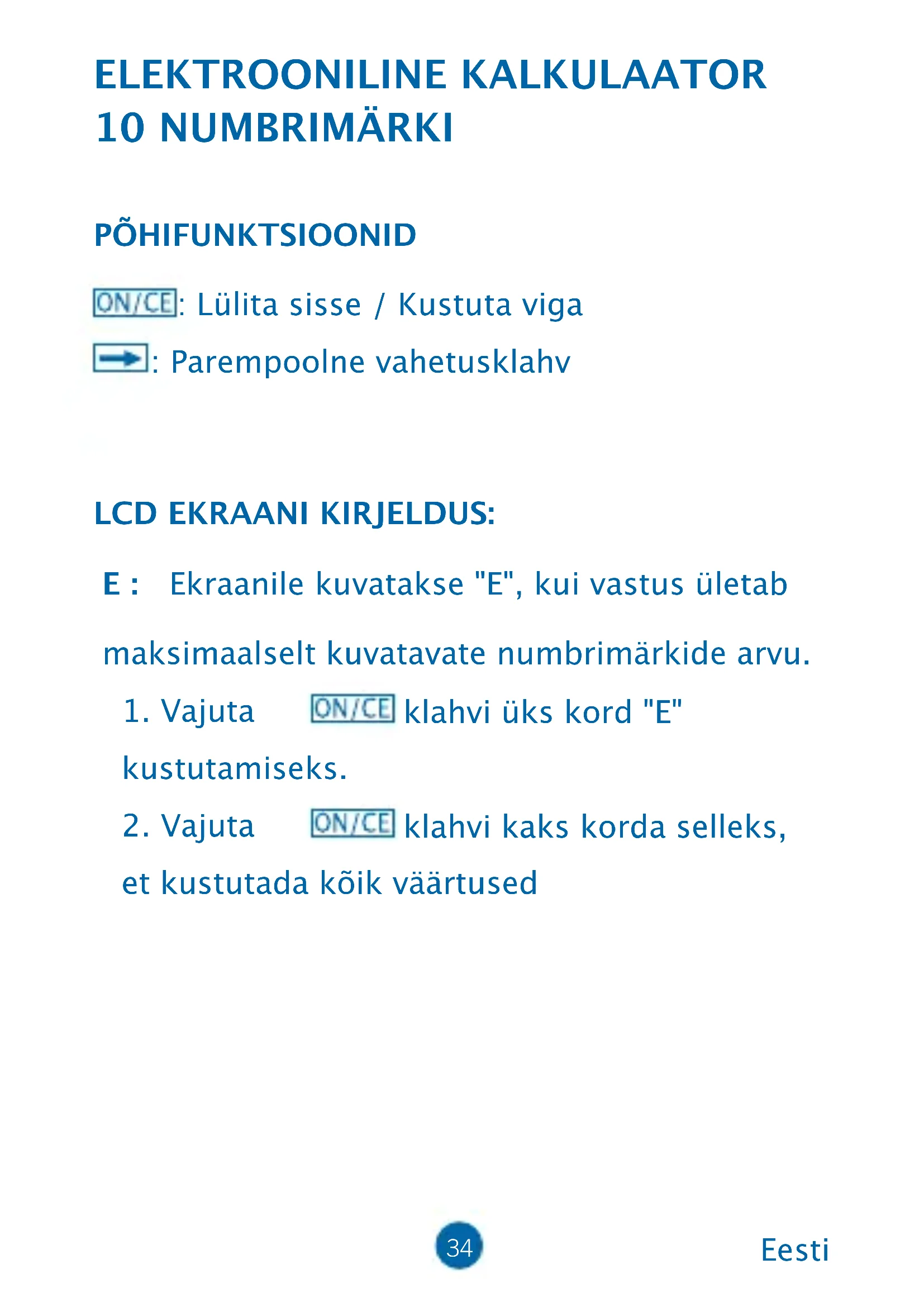 klahvi kaks korda selleks, et kustutada kõik väärtused35 Eesti ARVUTUSTEHTE NÄIDIS: EKRAANTEHENÄIDIS36 KUIDAS PATAREID VAHETADA:
