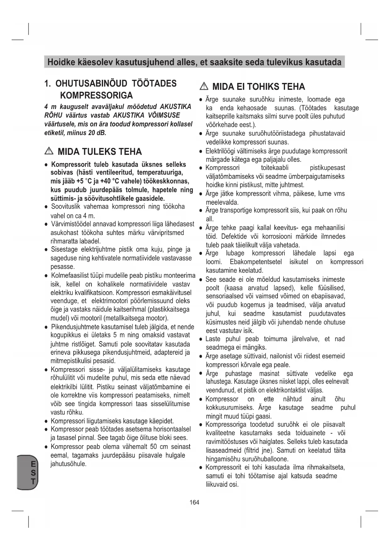 Ärge puhastage masinat süttivate vedelike ega lahustega.Kasutageüksnesniisketlappi,olleseelnevalt veendunud,etpistikonelektrikontaktistväljas. ● Kompressor on ette nähtud ainult õhu kokkusurumiseks. Ärge kasutage seadme puhul mingitmuudtüüpigaasi. ● Kompressoriga toodetud suruõhk ei ole piisavalt kvaliteetne kasutamaks seda toiduainete - või ravimitööstusesvõihaiglates.Sellekstulebkasutada lisaseadmeid (filtrid jne). Samuti on keelatud täita hingamisõhusuruõhuballoone. ● Kompressorit ei tohi kasutada ilma rihmakaitseta, samuti ei tohi töötamise ajal katsuda seadme liikuvaidosi.165