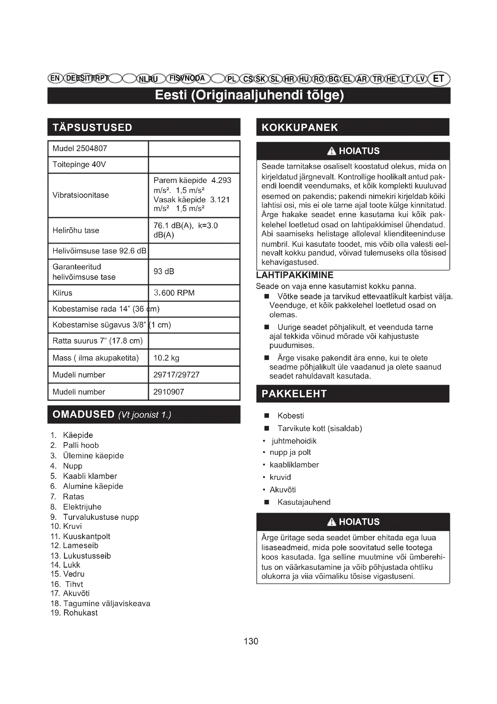 - Akuvõti Kasutajauhend HOIATUS Ärge üritage seda seadet ümber ehitada ega luua lisaseadmeid, mida pole soovitatud selle tootega koos kasutada. Iga selline muutmine või ümberehi- tus on väärkasutamine ja võib põhjustada ohtliku olukorra ja viia võimaliku tõsise vigastuseni. TÄPSUSTUSED Mudel 2504807 Toitepinge 40V Vibratsioonitase Parem käepide 4.293 m/s². 1,5 m/s² Vasak käepide 3.121 m/s² 1,5 m/s² Helirõhu tase