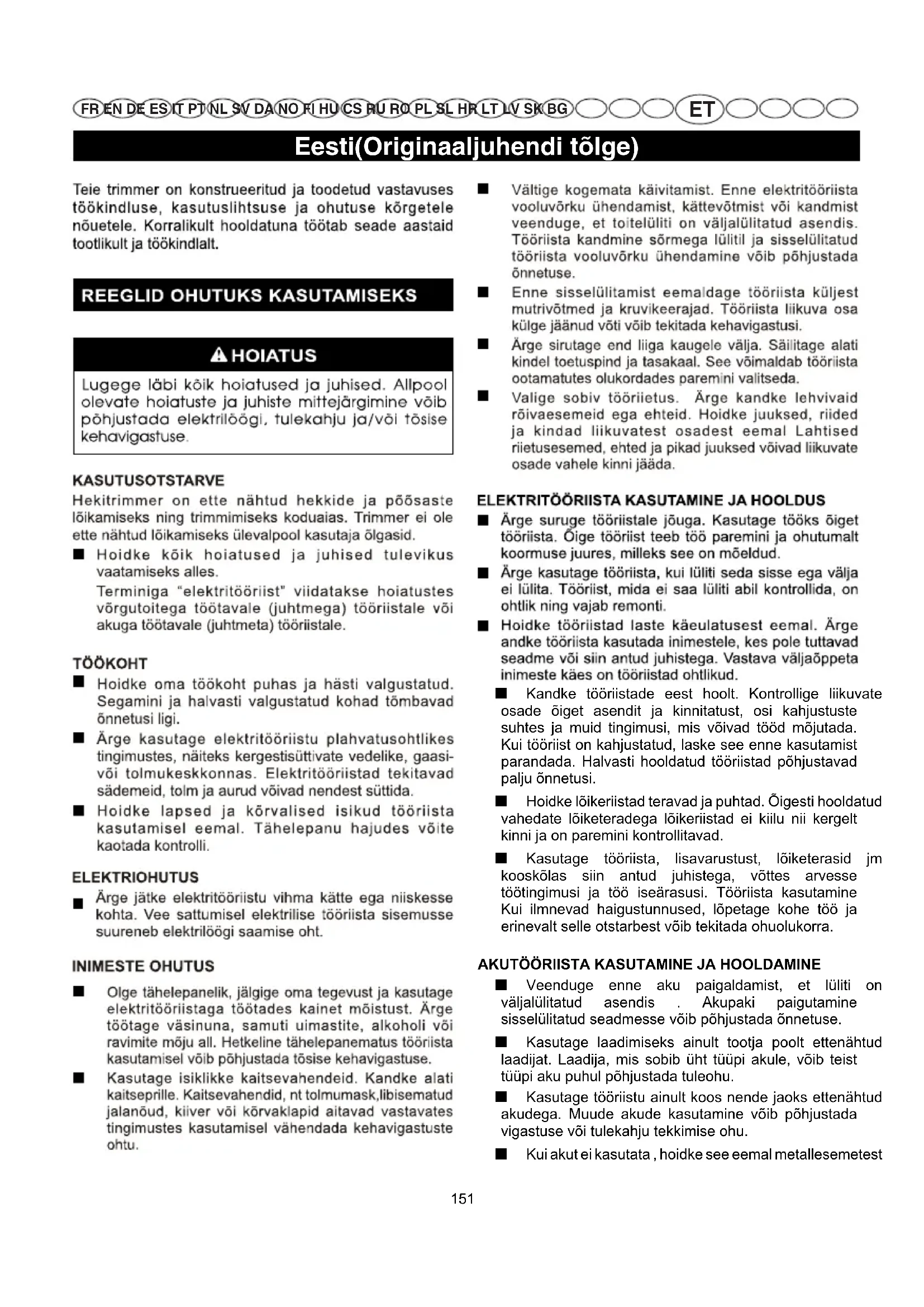 ■ Lugege juhiseid hoolikalt. Õppige tundma seadme juhtseadiseid ja korrektset kasutamist. ■ Ärge töötage selle seadmega, kui olete väsinud, uimastite, alkoholi või ravimite mõju all. ■ Kontrollige seadet enne selle kasutamist. Asendage kahjustatud osad. Kontrollige, et aku ei lekiks. ■ Veenduge, et kõik kinnitused ja kaitsed on oma kohal ja kindlalt kinni. Asendage lõiketerad ja mis tahes muud osad, mis on pragunenud, tükkideks läinud või muul viisil kahjustunud. Veenduge, et lõiketera on korralikult paigaldatud ja tugevalt kinnitatud. Vastasel korral võivad kasutaja ja kõrvalseisjad saada kehavigastusi ning samuti võib kahjustuda seade. ■ Kasutage tööriista eesmärgipäraselt. Kasutage tööriista ainult selleks, milleks see on ette nähtud. ■ Ärge kasutage tööriista, kui lüliti seda sisse ega välja ei lülita. Tööriist, mida ei saa lüliti abil kontrollida, on ohtlik ning vajab remonti. ■ Puhastage tööpiirkond enne iga kasutamist. Eemaldage kõik objektid nagu kaablid, lambid, juhtmed ja nöörid, mis võivad lõiketera külge takerduda. ■ Eemaldage piirkonnast eemal lapsed, kõrvalised isikud ja koduloomad. Hoidke kõik lapsed, kõrvalised isikud ja koduloomad vähemalt 15 m kaugusel, sest neid võivad tabada lenduvad esemed. Kõrvalistel isikutel tuleb soovitada kanda kõrvaklappe. Kui keegi teile läheneb, lülitage seade otsekohe välja. ■ Elektrilöögi ohu vältimiseks ärge kasutage seadet niisketes kohtades. ■ Ärge käsitsege seadet märgade kätega. ■ Ärge lubage alla 15-aastastel lastel ega väljaõppeta isikutel seadet kasutada. ■ Kehavigastuse tekkimise ohu vähendamiseks kandke seadme kasutamisel alati täielikku nägemiskaitset. ■ Kui töötamisel tekib tolmu, kandke näo- või tolmumaski. ■ Valige sobiv tööriietus. Ärge kandke lahtisi riietusesemeid ega ehteid, sest need võivad seadme liikuvate osade külge takerduda. Välitöödel on soovitatav kanda kummikindaid ja tugevaid jalanõusid. ■ Et vältida juuste tõmbamist lähedal asuvatesse ventilatsiooniavadesse ja liikuvate osade külge kinnijäämist, kandke pikkade juuste puhul kaitsvat peakatet või kinnitage kaetud juuksed õlgadest kõrgemal. ■ Ärge kasutage elektrilisi või akutoitega tööriistu vihma käes ega niiske ilmaga. ■ Seadme transportimisel ja hoiule asetamisel asetage alati peale lõiketera kate. ■ Tutvuge ümbrusega ja olge tähelepanelik võimalike ohtude suhtes, mida te ei pruugi märgata masina müra tõttu. ■ Kujundage endale harjumuseks kontrollida enne tööriista käivitamist, et kõik seadistus- ja mutrivõtmed on eemaldatud. ■ Tööriista kasutades veenduge alati, et kõik käepidemed ja katised on õigesti kinnitatud. ■ Ärge kasutage mittetäielikku või ilma loata ümber ehitatud seadet. ■ Olenevalt seadme kasutusviisist võib mehaanilise tööriista töötamisel ilmneda vibratsiooniheide, mille suurus erineb deklareeritud väärtustest. ■ Teadaolevalt võib käsitööriistade kasutamine põhjustada mõnedel inimestel tõbe, mida nimetakse Raynaud’s Syndrome. Sümptomitena võib ilmneda sõrmede tuimus ja valkjaks muutumine, mis tavaliselt ilmneb külmas töötamisel. Nende sümptomite puhul tuleb hoiduda külmast ja niiskusest, dieedist ning suitsetamisest ja kasutada õigeid töövõtteid. Vibratsiooni mõju vähendamiseks tuleb rakendada järgmisi abinõusid.