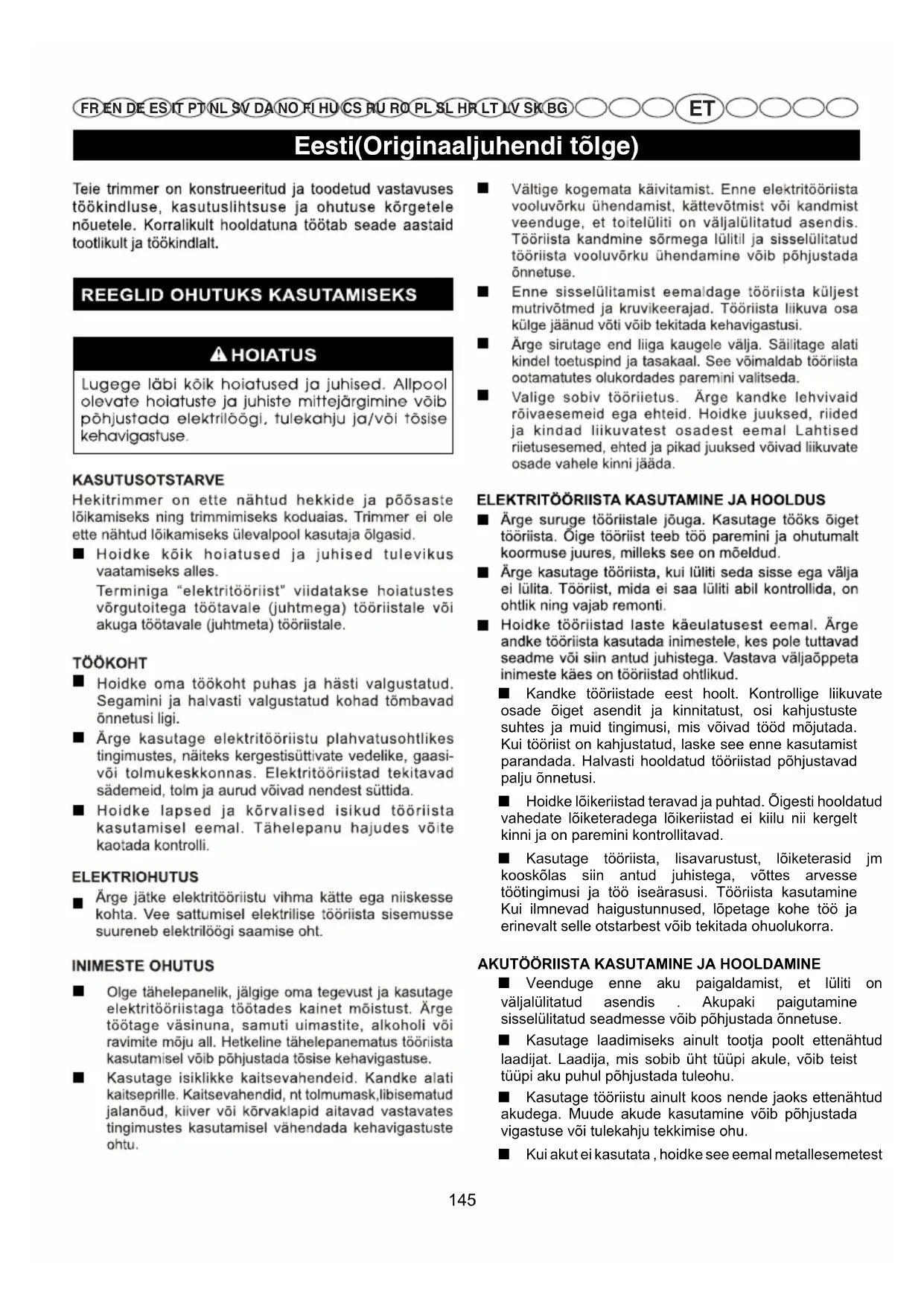 - Tehke regulaarselt töövaheaegasid. Piirake tööpe- rioodi pikkust. Kui ilmnevad haigustunnused, lõpetage kohe töö ja pöörduge arsti poole. KASUTAMISE AJAL ■ Ärge kasutage trimmerit ilma oma kohal oleva eesmise käepidemeta. Hoidke seadme kasutamisel mõlema käega selle käepidemetest kinni. ■ Juhusliku käivitumise vältimiseks ärge kandke seadet kunagi nii, et sõrm on päästikul. ■ Olge tähelepanelik ja keskenduge sellele, mida teete. Juhinduge seadme kasutamisel kainest mõistusest. ■ Kandke tugevaid pikki pükse, tugevaid saapaid ja hästi istuvaid kindaid. Ärge kandke lühikesi pükse ega sandaale ega olge paljajalu. ■ Ärge kasutage viletsa valgustuse korral. Kasutage seadet ainult päevavalguses või hea kunstliku valgustuse korral. ■ Ärge kallutage end liigselt ega seiske ebakindlal alusel. Säilitage alati kindel toetuspind ja tasakaal. Ärge kasutage seadet redelil seistes. ■ Ärge suruge tööriistale jõuga. Seade töötab paremini ja väiksema vigastuse tekkimise ohu juures, kui kasutate seda ettenähtud piirides. ■ Enne hooldamist, parandamist ja seadistamist vabastage päästik, laske mootoril seisma jääda ja eemaldage aku. ■ See hekitrimmer on mõeldud ainult hekkide, põõsaste ja puhmaste lõikamiseks. Ärge kasutage seadet mingiks muuks otstarbeks. ■ Enne seadme käivitamist veenduge, et lõiketera ei satu millegagi kontakti. ■ Kui tabate võõrkehi või takerdute nendesse, peatage seade otsekohe, eemaldage aku ja kontrollige, kas seade on kahjustada saanud. Kahjustunud s e a d et ärge enne parandamist kasutage . Ärge kasutage lahtiste või katkiste osadega seadet. ■ Keskenduge sellele, mida teete. Juhinduge töötamisel kainest mõistusest. ■ Hoidke oma tööriista hoolega. Hoidke lõiketera parema töö ja vigastuste tekkimise ohu vähendamise huvides terava ja puhtana. Järgige õlitamisel ja lisatarvikute vahetamisel juhiseid. Hoidke käepidemed kuivad, puhtad ning õli- ja määrdevabad. ■ Kontrollige kahjustatud osi. Enne tööriista edasist kasutamist tuleb vigastatud kaitset või osa hoolega kontrollida, veendumaks, et see töötab korralikult ja täidab oma ülesannet. Kontrollige liikuvate osade õiget asendit ja vaba liikumist, osade kahjustusi, kinnitusi ja muid tingimusi, mis võivad tööd mõjutada. Viga saanud kate või muu osa tuleks volitatud teeninduses korralikult parandada või välja vahetada, kui selles kasutusjuhendis pole öeldud teisiti. ■ Lõikevigastuse oht. Hoidke käed lõiketeradest eemal. Ärge püüdke lõigatavat materjali eemaldada või seda kinni hoida siis, kui lõiketerad liiguvad.Enne lõiketerade puhastamist nende külge jäänud materjalist veenduge, et aku on eemaldatud ja päästik on vabastatud. Ärge võtke seadme tõstmisel või hoidmisel kinni katmata lõiketerast. ETTEVAATUST Lõiketerad jätkavad liikumist pärast väljalülitamist veel mõne sekundi jooksul. ■ Hoidke käed, nägu ja jalad seadme liikuvatest osadest ohutul kaugusel. Kui lõiketerad liiguvad, ärge puudutage ega püüdke neid peatada. ■ Kui ootate võimalust niita või kõnnite ühest niitmiskohast teise, lülitage mootor alati välja. ■ Hoidke seade puhas rohulibledest ja muust taolistest asjadest. Need võivad koguneda lõiketeradele. ■ Hoidke seadet kuivas kohas, kas luku taga või kõrgel, et vältida selle volitamata kasutamist ja kahjustamist. Hoidke seadet lastele ja väljaõppeta isikutele kättesaamatus kohas. ■ Kui te seadet ei kasuta, asetage peale lõiketera kate. ■ Ärge kunagi kastke seadet vette ega mingisse muusse vedelikku ega pritsige seda. Hoidke käepidemed kuivad, puhtad ja prügivabad. Puhastage seade pärast iga kasutamist, vt hoidmisjuhiseid. ■ Kinnitage seade selle transportimisel. ■ Hoidke need juhised alles. Lugege neid sageli ja võtke need aluseks teiste kasutajate õpetamisel. Seadet kellelegi laenates andke kaasa ka need juhised. TEENINDAMINE Seda seadet tohib teenindada ainult kvalitseeritud personal. Kvalitseerimata personali tehtud teenindus või hooldus võib lõppeda kasutajale kehavigastusega või seadme kahjustada saamisega. Samuti võib see tühistada teie garantii.Tööriista teenindades kasutage alati identseid varuosi. Jälgige selle kasutusjuhendi jaotises Hooldamine antud juhiseid. Valede varuosade kasutamine või hooldusjuhiste mittejärgimine võib kasutajale kaasa tuua tõsise kehavigastuse, elektrilöögi ohu või kahjustada seadet. Samuti võib see tühistada teie garantii. 147Eesti(Originaaljuhendi tõlge)