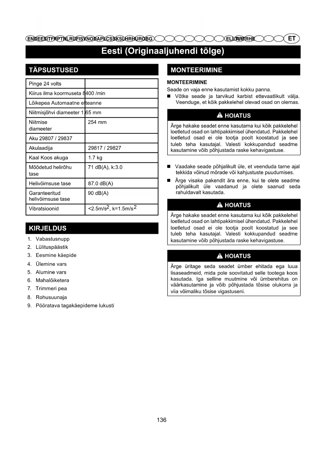 EN DE ES IT FR PT NL RU FI SV NO DA PL CS SK SL HR HU RO BGAR TR HEEL LT LV TÄPSUSTUSED Pinge 24 volts Kiirus ilma koormuseta 8400 /min Lõikepea Automaatne etteanne Niitmisjõhvi diameeter 1.65 mm Niitmise diameeter 254 mm Aku 29807 / 29837 Akulaadija 29817 / 29827 Kaal Koos akuga 1.7 kg Mõõdetud helirõhu tase 71 dB(A), k:3.0 Helivõimsuse tase 87.0 dB(A) Garanteeritud helivõimsuse tase 90 dB(A) Vibratsioonid <2.5m/s
