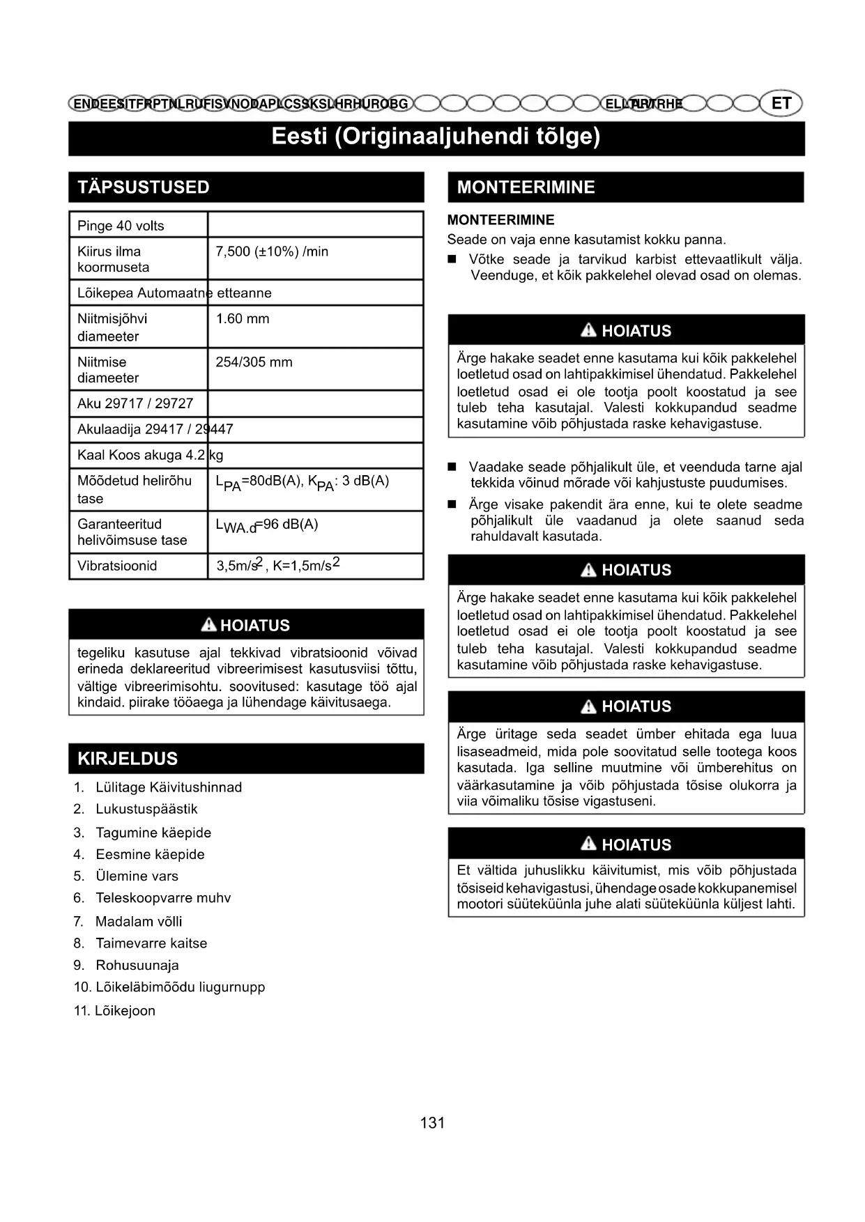 EN DE ES IT FR PT NL RU FI SV NO DA PL CS SK SL HR HU RO BGAR TR HEEL LT LV ROHUKAITSE PAIGALDAMINE Vaata Joonis 2. HOIATUS Rohusuunajal asub terav mahalõiketera. Vältige kokkupuudet teraga. Muidu võite saada raske kehavigastuse. Pöörake murutrimmer ümber, et trimmeripeale ligi pääseda. Pange trimmeripeale kaitsekate (2). Ühitage kaitsekattel olevad kruviavad trimmeripeal olevate kruviavadega. Pange trimmeripea avadesse kruvid ja kinnitage kaitsekate Phillips-kruvikeerajaga (pole komplektis). VARRE KOKKUPANEK. Vaadake joonist 3. Tööorgan ühendatakse ajampea külge ühendusmuhvi abil. Pange seade tugevale horisontaalsele pinnale. Lõdvendage käsikruvi (1), mis asub muhvil (5). Vajutage sisse alumisel varrel (3) olev nupp (2). Joondage nupp juhtsoonega (4) ja lükake võllid kokku. Pöörake alumist vart kuni nupp lukustub asendi fikseerimisavasse. Keerake käsikruvi tugevasti kinni. MÄRKUS. Kui nupp kseerimisavas täielikult ei vabane, ei ole võll oma kohale lukustunud. Keerake veidi küljelt- küljele kuni nupp lukustub oma kohale. TAGUMISE PÖÖRDKÄEPIDEME KASUTAMINE. Vaadake joonist 4. Suruge lisakäepide (1) ülemisele varrele, nii et see on sama nurga all tagumise käepidemega, mis tagab mugava töötamise. Lükake lisakäepide üle metallrõnga (2), nii et metallrõngas sobitub lisakäepideme soone sisse. Ühitage lisakäepideme avad metallrõnga avaga. Pange käsikruvi (3) läbi lisakäepideme. Keerake see kinni, nii et käepide jääb liikumatuks. KASUTAMINE HOIATUS Olge alati, ka siis kui tunnete masinat, ettevaatlik. Piisab ühest hetkest, mil tähelepanu hajub ja võib kaasa tuua raskeid vigastusi. HOIATUS Kaitske alati silmi. Nõude täitmata jätmine võib põhjustada raskeid vigastusi, kui mõni osa paiskub silma. HOIATUS Ärge kunagi kasutage trimmeril lõikekettaid, liigendterasid, traati või nööri. Ärge kasutage lisaseadmeid ega lisandeid, mida pole selle toote tootja soovitanud. Soovitamata lisaseadmete ja lisandite kasutamine võib põhjustada tõsist enese vigastamist. MÄRKUS: Raskete kehavigastuste vältimiseks trimmeri kandmise ja transportimise ajal võtke akupakett välja ja ärge hoidke kätt lukustusnupul. AKU PAIGALDAMINE Vaata Joonis 5. Asetage aku trimmerisse. Joondage aku vabastustiib trimmeri akuruumi sisemiste avadega. Enne masina kasutama hakkamist kontrollige, et sulgurkeel, mis asub aku all, oleks korralikult kinni ja aku ise ei liiguks. AKU EEMALDAMINE Vaata Joonis 5. Trimmeri seiskamiseks vabastage lülituspäästik ja lukustuspäästik. Hoidke all akupaketi tagaosas olevat riivistusnupp (1). Hoidke ühe käega kinni trimmeri käepidemest (2) ja samal ajal vajutage alla aku riiv, et aku vabastada. TRIMMERI KÄIVITAMINE/SEISKAMINE. Vaadake joonist 6. Veenduge, et trimmeri aku on täielikult laetud. Trimmeri käivitamiseks vajutage sisse lukustusnupp (1) ja suruge lülituspäästikut (2). Trimmeri seiskamiseks vabastage lülituspäästik. 132Eesti (Originaaljuhendi tõlge)