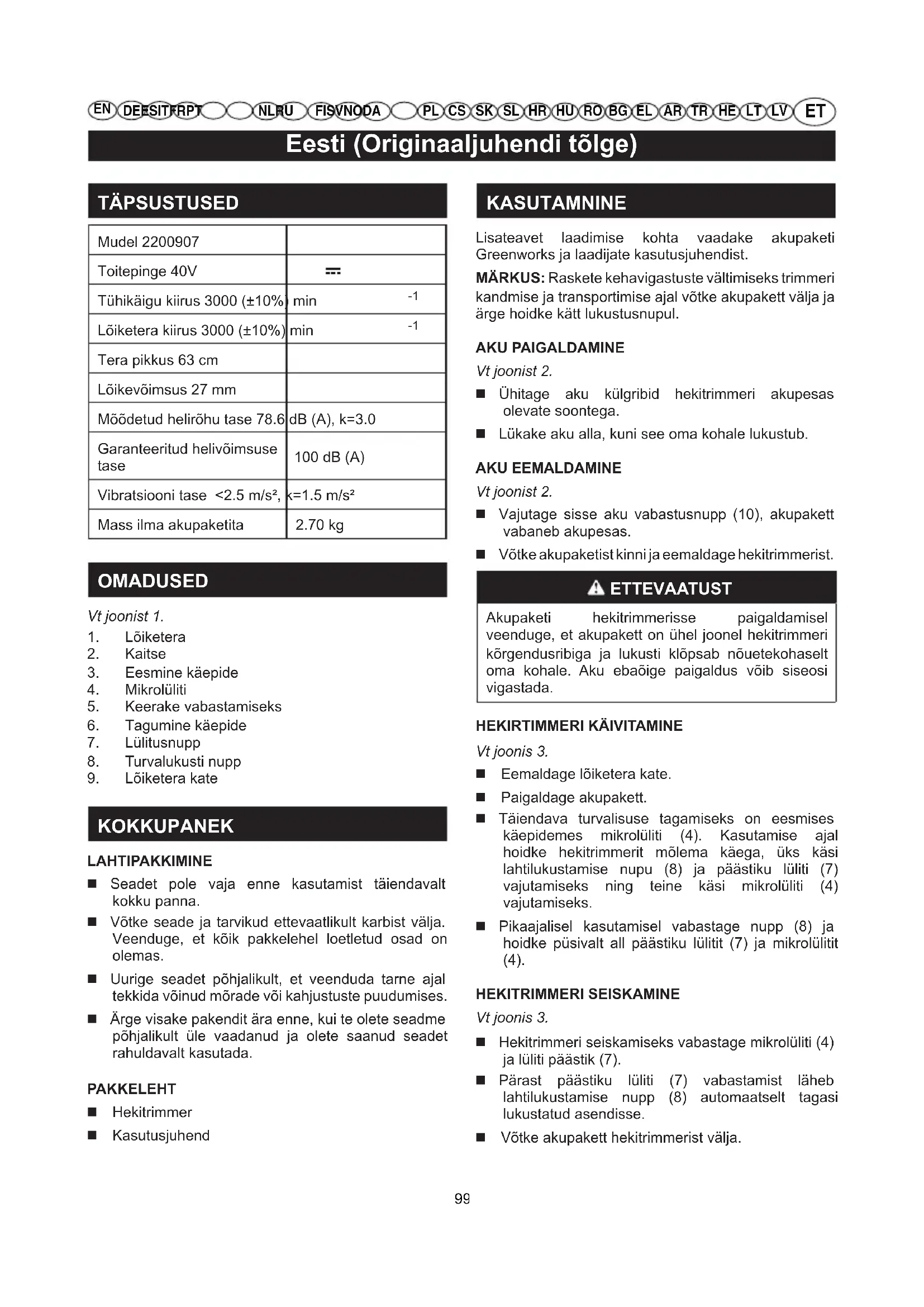KOKKUPANEK LAHTIPAKKIMINE Seadet pole vaja enne kasutamist täiendavalt kokku panna. Võtke seade ja tarvikud ettevaatlikult karbist välja. Veenduge, et kõik pakkelehel loetletud osad on olemas. Uurige seadet põhjalikult, et veenduda tarne ajal tekkida võinud mõrade või kahjustuste puudumises. Ärge visake pakendit ära enne, kui te olete seadme põhjalikult üle vaadanud ja olete saanud seadet rahuldavalt kasutada. PAKKELEHT Hekitrimmer Kasutusjuhend KASUTAMNINE Lisateavet laadimise kohta vaadake akupaketi Greenworks ja laadijate kasutusjuhendist. MÄRKUS: Raskete kehavigastuste vältimiseks trimmeri kandmise ja transportimise ajal võtke akupakett välja ja ärge hoidke kätt lukustusnupul. AKU PAIGALDAMINE Vt joonist 2. Ühitage aku külgribid hekitrimmeri akupesas olevate soontega. Lükake aku alla, kuni see oma kohale lukustub. AKU EEMALDAMINE Vt joonist 2. Vajutage sisse aku vabastusnupp (10), akupakett vabaneb akupesas. Võtke akupaketist kinni ja eemaldage hekitrimmerist. ETTEVAATUST Akupaketi hekitrimmerisse paigaldamisel veenduge, et akupakett on ühel joonel hekitrimmeri kõrgendusribiga ja lukusti klõpsab nõuetekohaselt oma kohale. Aku ebaõige paigaldus võib siseosi vigastada.