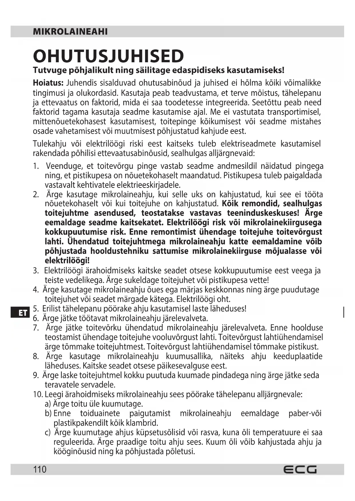 Kasutage mikrolaineahju ainult vastavalt selle kasutusjuhendi juhistele. Mikrolaineahi on ettenahtud kasutamiseks ainult koduses majapidamises. Valmistaja ei vastuta seadme mittenouetekohasest kasutamisest pöhjustatud kahjustuste eest.
