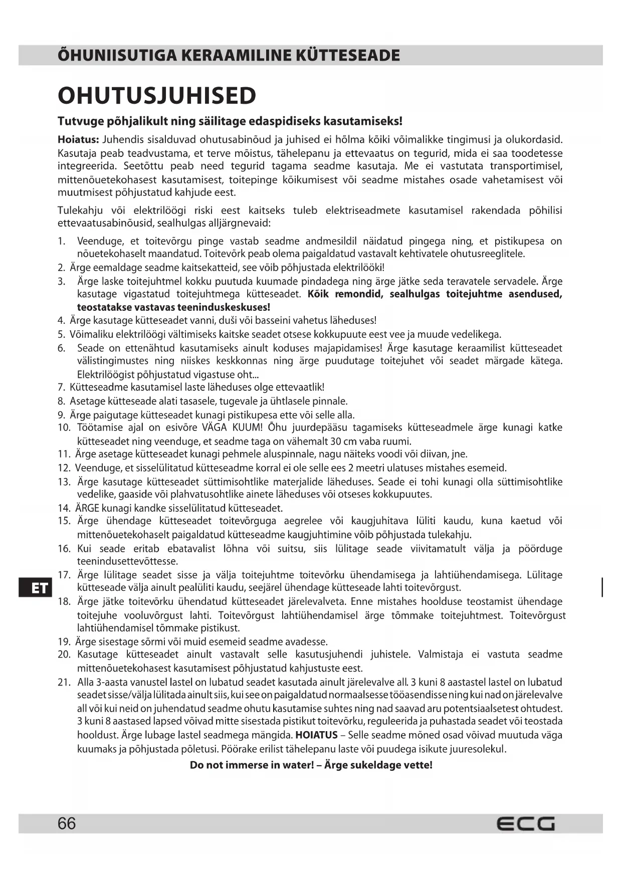 - Seade on ettenahtud kasutamiseks ainult koduses majapidamises! Arge kasutage keraamilist kutteseadet valistingimustes ning niiskes keskkonnas ning arge puudutage toitejuhet voi seadet margade katega. Elektrilogist pohjustatud vigastuse oht...