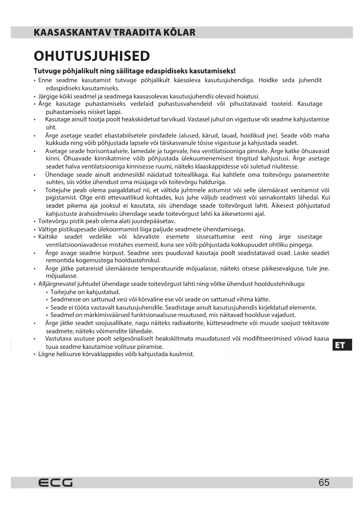 - Ärge avage seadme korpust. Seadme sees puuduvad kasutaja poolt seadistatavad osad. Laske seadet remontida kogemustega hooldustehnikul.