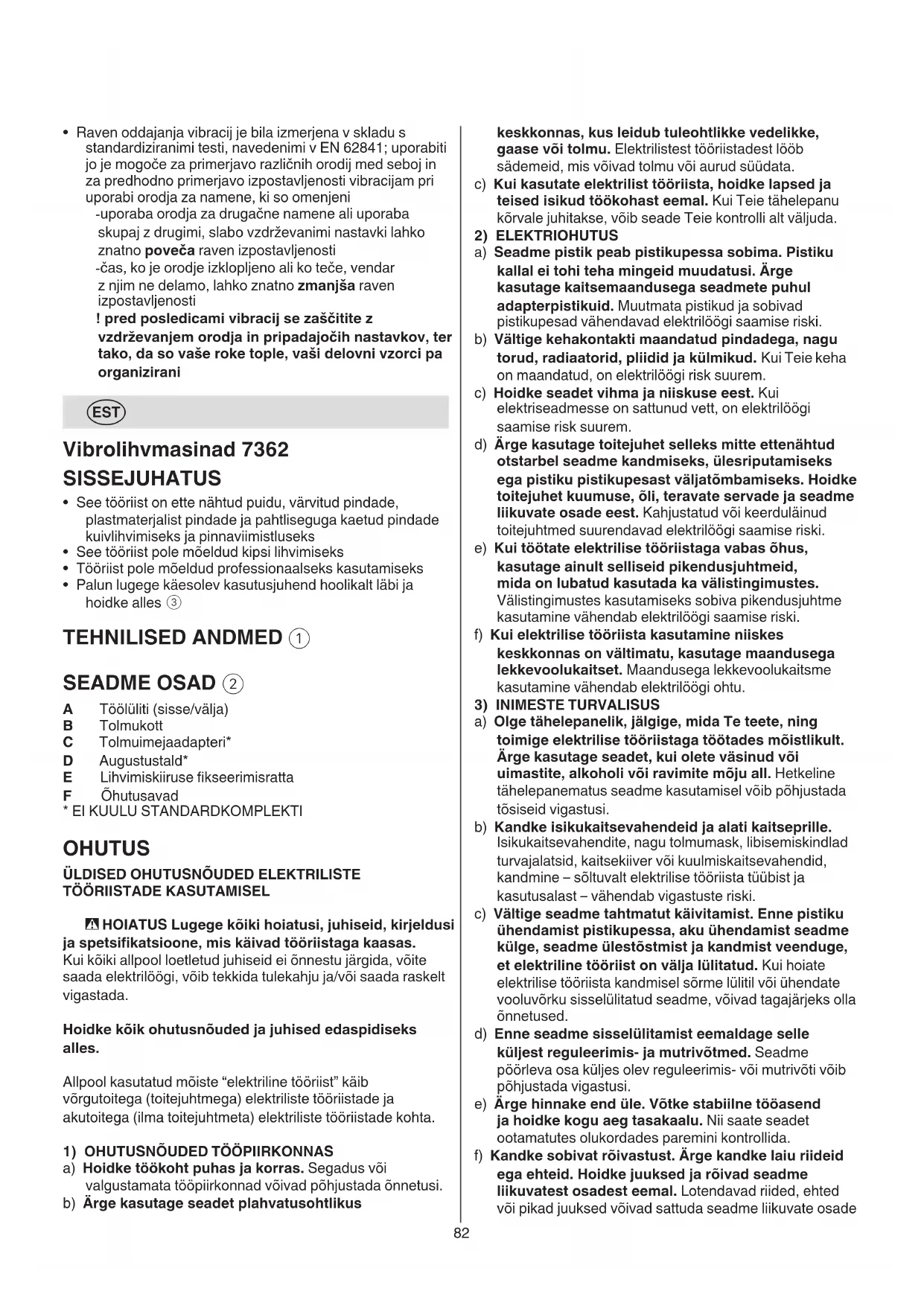 - Standardiga EN 62841 kooskõlas mõõdetud tööriista helirõhu tase on 85,1 dB(A) ja helivõimsuse tase 96,1 dB(A) (määramatus K = 3 dB), ja vibratsioon 6,4 m/s² (ruumiliste vektorite summa; mõõtemääramatus K = 1,5 m/s²)