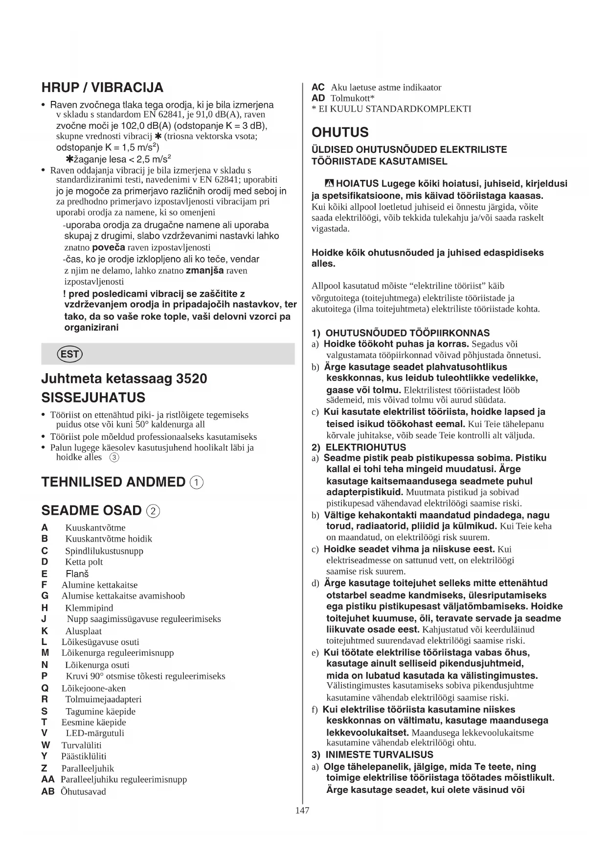- Tekkiva vibratsiooni tase on mõõdetud vastavalt standardis EN 62841 kirjeldatud standarditud testile; seda võib kasutada tööriistade võrdlemiseks ja tööriista kasutamisel ettenähtud töödeks esineva vibratsiooni esialgseks hindamiseks - tööriista kasutamisel muudeks rakendusteks või teiste/halvasti hooldatud tarvikute kasutamisel võib vibratsioon märkimisväärselt suureneda - ajal, kui tööriist on väljalülitatud või on küll sisselülitatud, kuid tegelikult seda ei kasutata, võib vibratsioon märkimisväärselt väheneda ! enda kaitsmiseks vibratsiooni eest hooldage tööriista ja selle tarvikuid korralikult, hoidke oma käed soojad ja tagage sujuv töökorraldus