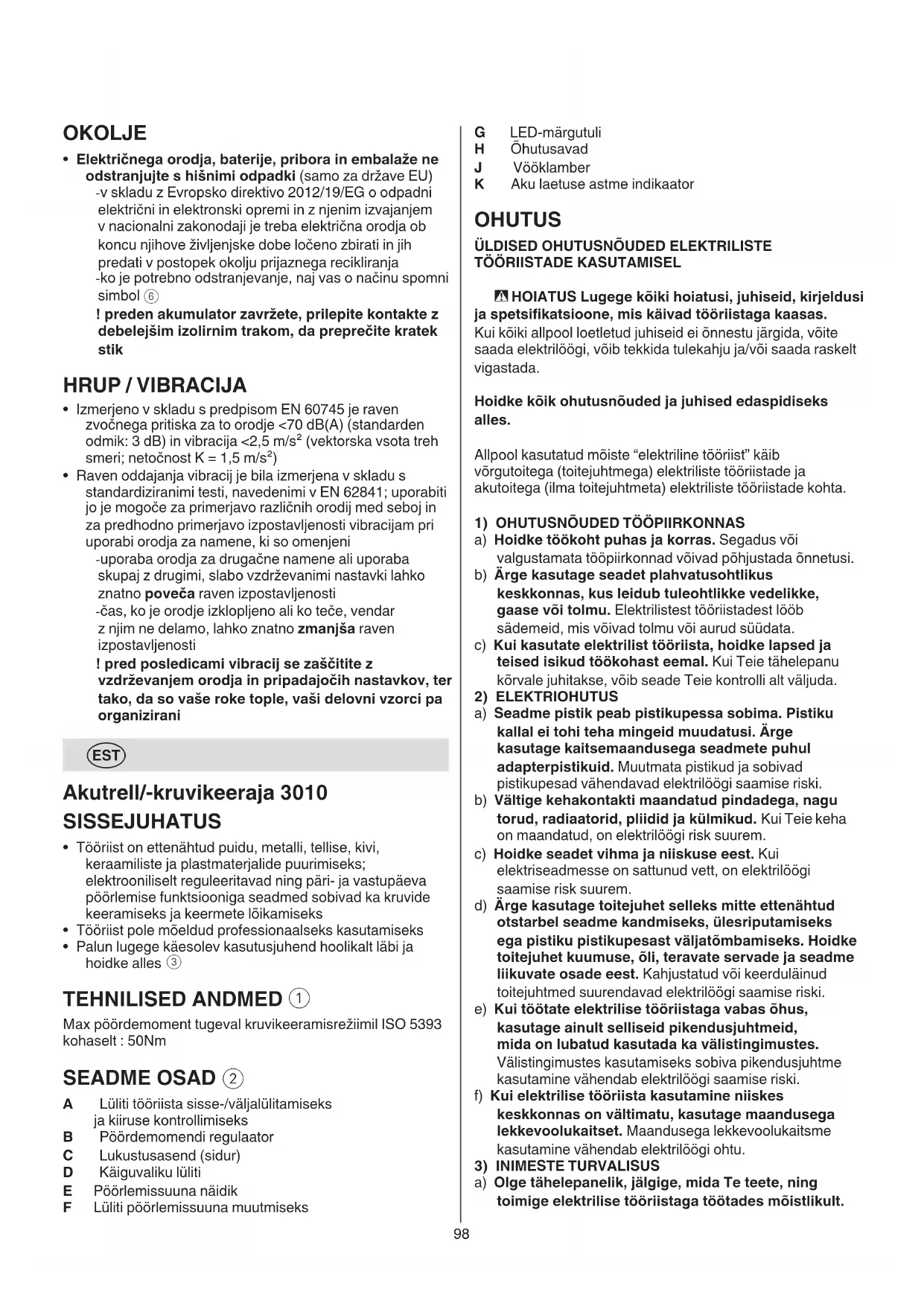 - majhna hitrost - večji moment98 G LED-märgutuli H Õhutusavad J Vööklamber K Aku laetuse astme indikaator OHUTUS