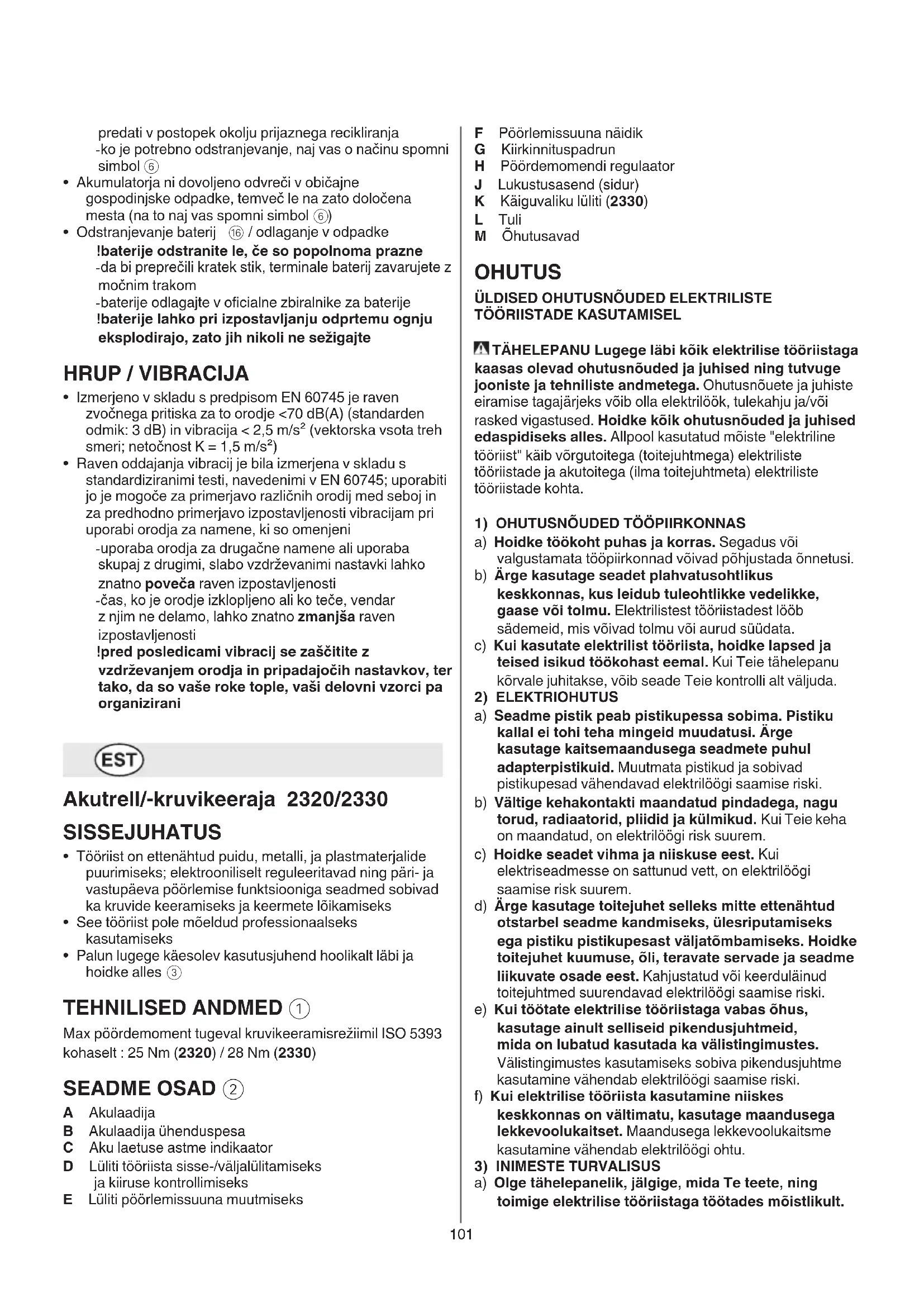 - Tekkiva vibratsiooni tase on mõõdetud vastavalt standardis EN 60745 kirjeldatud standarditud testile; seda võib kasutada tööriistade võrdlemiseks ja tööriista kasutamisel ettenähtud töödeks esineva vibratsiooni esialgseks hindamiseks - tööriista kasutamisel muudeks rakendusteks või teiste/halvasti hooldatud tarvikute kasutamisel võib vibratsioon märkimisväärselt suureneda