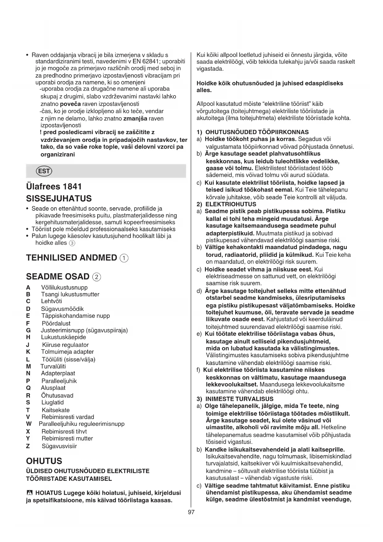 A Võllilukustusnupp B Tsangi lukustusmutter C Lehtvõti D Sügavusmõõdik E Täppiskohandamise nupp F Pöördalust G Justeerimisnupp (sügavuspiiraja) H Lukustuskäepide J Kiiruse regulaator K Tolmuimeja adapter L Töölüliti (sisse/välja) M Turvalüliti N Adapterplaat P Paralleeljuhik Q Alusplaat R Õhutusavad S Liuglatid T Kaitsekate V Rebimisresti vardad W Paralleeljuhiku reguleerimisnupp X Rebimisresti tihvt Y Rebimisresti mutter Z Sügavusvisiir OHUTUS