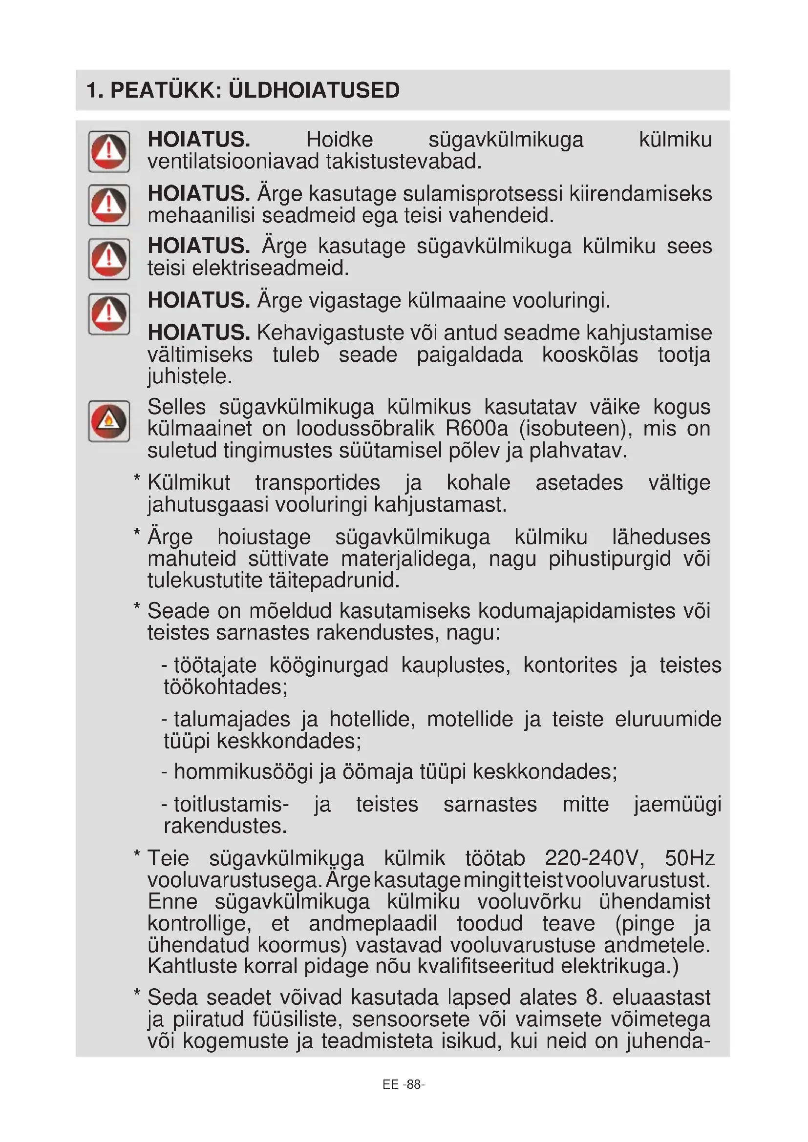 HOIATUS. Hoidke sügavkülmikuga külmiku ventilatsiooniavad takistustevabad. HOIATUS. Ärge kasutage sulamisprotsessi kiirendamiseks mehaanilisi seadmeid ega teisi vahendeid. HOIATUS. Ärge kasutage sügavkülmikuga külmiku sees teisi elektriseadmeid. HOIATUS. Ärge vigastage külmaaine vooluringi. HOIATUS. Kehavigastuste või antud seadme kahjustamise vältimiseks tuleb seade paigaldada kooskõlas tootja juhistele. Selles sügavkülmikuga külmikus kasutatav väike kogus külmaainet on loodussõbralik R600a (isobuteen), mis on suletud tingimustes süütamisel põlev ja plahvatav.