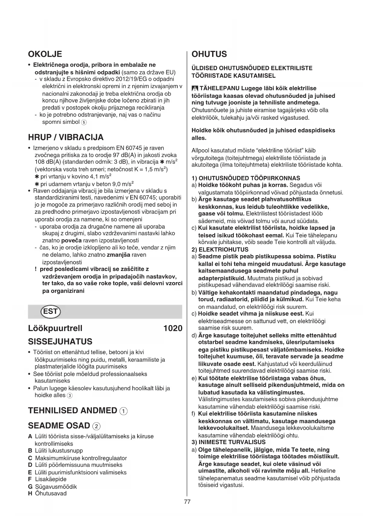 - Palun lugege käesolev kasutusjuhend hoolikalt läbi ja hoidke alles 3 TEHNILISED ANDMED 1 SEADME OSAD 2 A Lüliti tööriista sisse-/väljalülitamiseks ja kiiruse kontrollimiseks B Lüliti lukustusnupp C Maksimumkiiruse kontrollregulaator D Lüliti pöörlemissuuna muutmiseks E Lüliti puurimisfunktsiooni valimiseks F Lisakäepide G Sügavusmõõdik H Õhutusavad OHUTUS