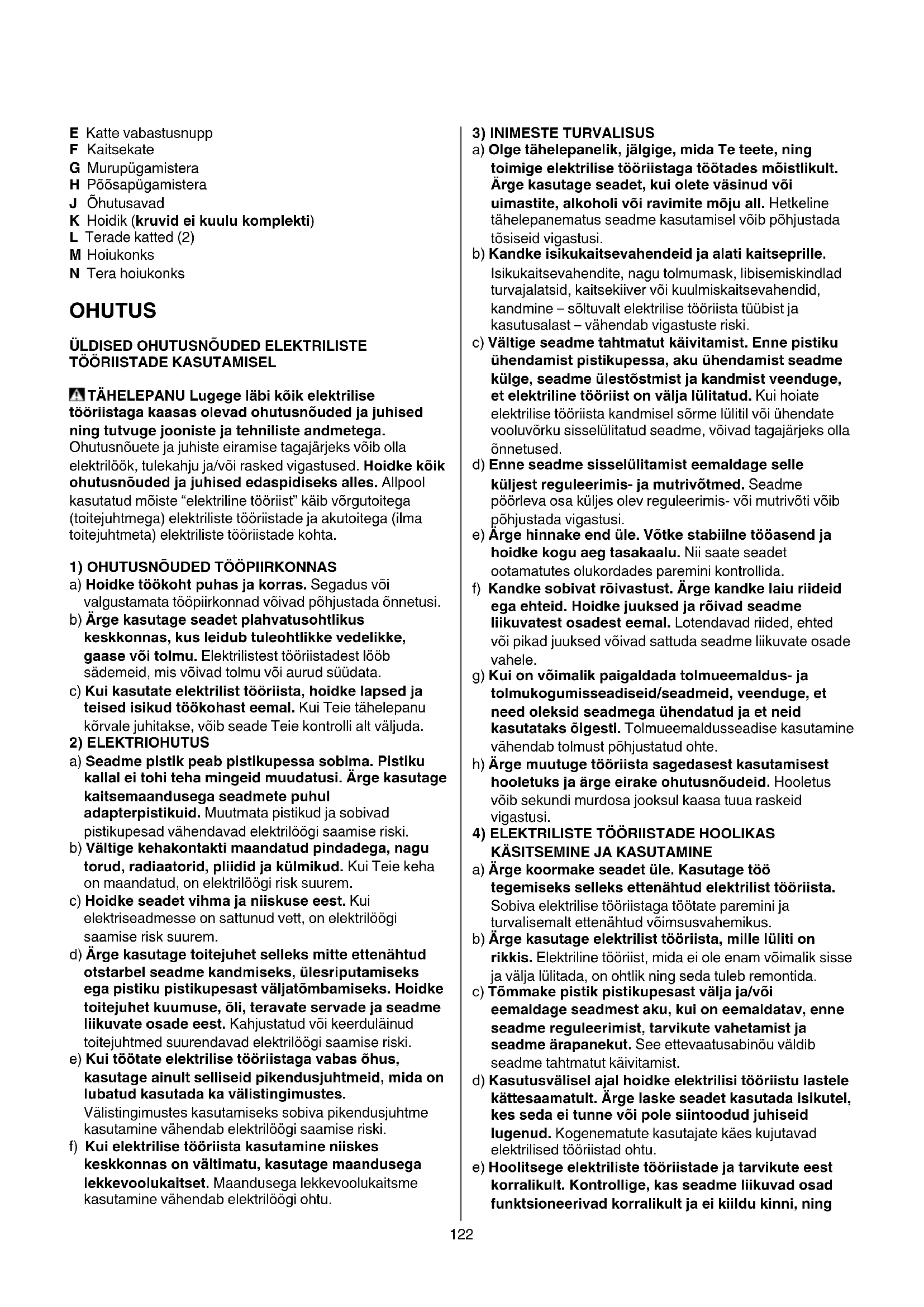 a) Ärge koormake seadet üle. Kasutage töö tegemiseks selleks ettenähtud elektrilist tööriista. Sobiva elektrilise tööriistaga töötate paremini ja turvalisemalt ettenähtud võimsusvahemikus. b) Ärge kasutage elektrilist tööriista, mille lüliti on rikkis. Elektriline tööriist, mida ei ole enam võimalik sisse ja välja lülitada, on ohtlik ning seda tuleb remontida. c) Tõmmake pistik pistikupesast välja ja/või eemaldage seadmest aku, kui on eemaldatav, enne seadme reguleerimist, tarvikute vahetamist ja seadme ärapanekut. See ettevaatusabinõu väldib seadme tahtmatut käivitamist. d) Kasutusvälisel ajal hoidke elektrilisi tööriistu lastele kättesaamatult. Ärge laske seadet kasutada isikutel, kes seda ei tunne või pole siintoodud juhiseid lugenud. Kogenematute kasutajate käes kujutavad elektrilised tööriistad ohtu. e) Hoolitsege elektriliste tööriistade ja tarvikute eest korralikult. Kontrollige, kas seadme liikuvad osad funktsioneerivad korralikult ja ei kiildu kinni, ning123 ega mõned osad ei ole katki või sel määral kahjustatud, et võiksid mõjutada seadme töökindlust. Laske kahjustatud osad enne seadme kasutamist parandada. Paljude õnnetuste põhjuseks on halvasti hooldatud elektrilised tööriistad. f) Hoidke lõiketarvikud teravad ja puhtad. Hoolikalt hoitud, teravate lõikeservadega lõiketarvikud kiilduvad harvemini kinni ja neid on lihtsam juhtida. g) Kasutage elektrilist tööriista, lisavarustust, tarvikuid jne vastavalt siintoodud juhistele. Arvestage seejuures töötingimuste ja teostatava töö iseloomuga. Elektriliste tööriistade kasutamine mitte ettenähtud otstarbel võib põhjustada ohtlikke olukordi. h) Hoidke käepidemed ja haardepinnad kuiva ja puhtana ning vabana õlist ja määrdeainetest. Libedad käepidemed ja haardepinnad ei luba tööriista ohutult käsitseda ja ootamatutes olukordades kontrolli all hoida.