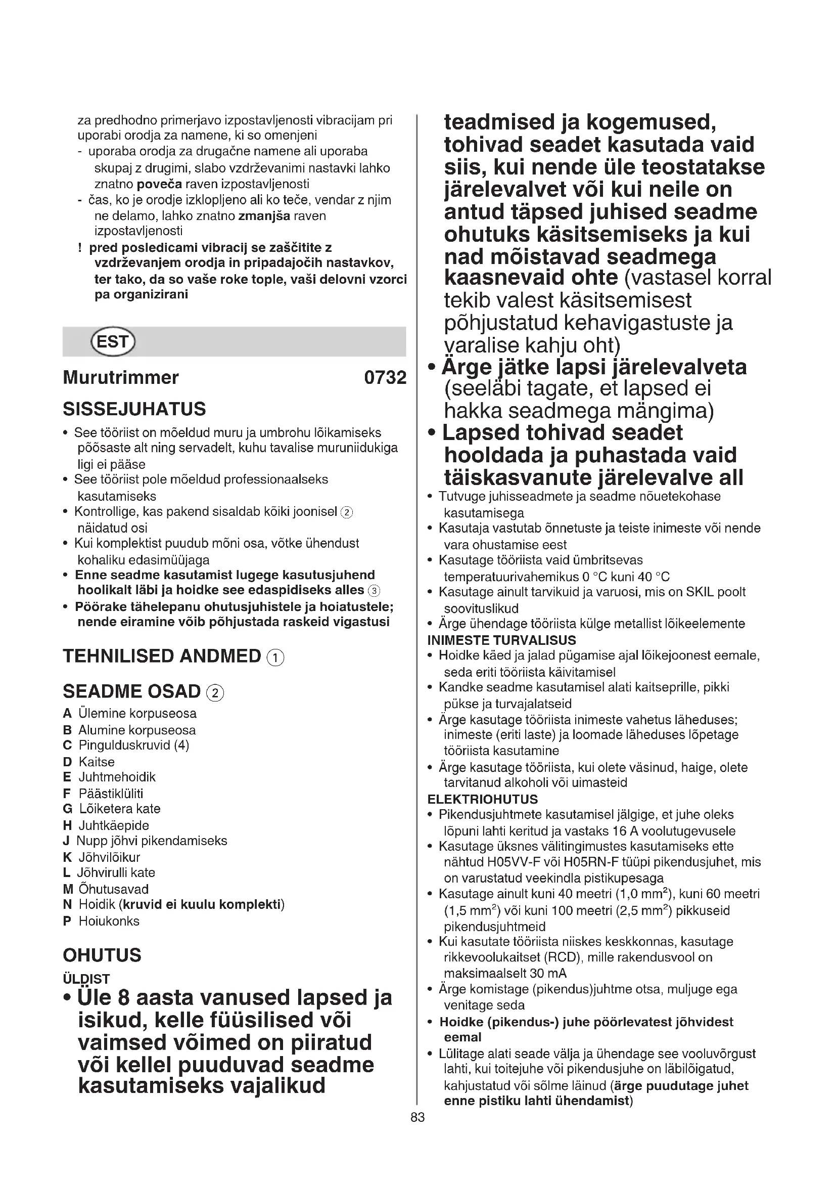 - Pöörake tähelepanu ohutusjuhistele ja hoiatustele; nende eiramine võib põhjustada raskeid vigastusi TEHNILISED ANDMED 1 SEADME OSAD 2 A Ülemine korpuseosa B Alumine korpuseosa C Pingulduskruvid (4) D Kaitse E Juhtmehoidik F Päästiklüliti G Lõiketera kate H Juhtkäepide J Nupp jõhvi pikendamiseks K Jõhvilõikur L Jõhvirulli kate M Õhutusavad N Hoidik (kruvid ei kuulu komplekti) P Hoiukonks OHUTUS ÜLDIST